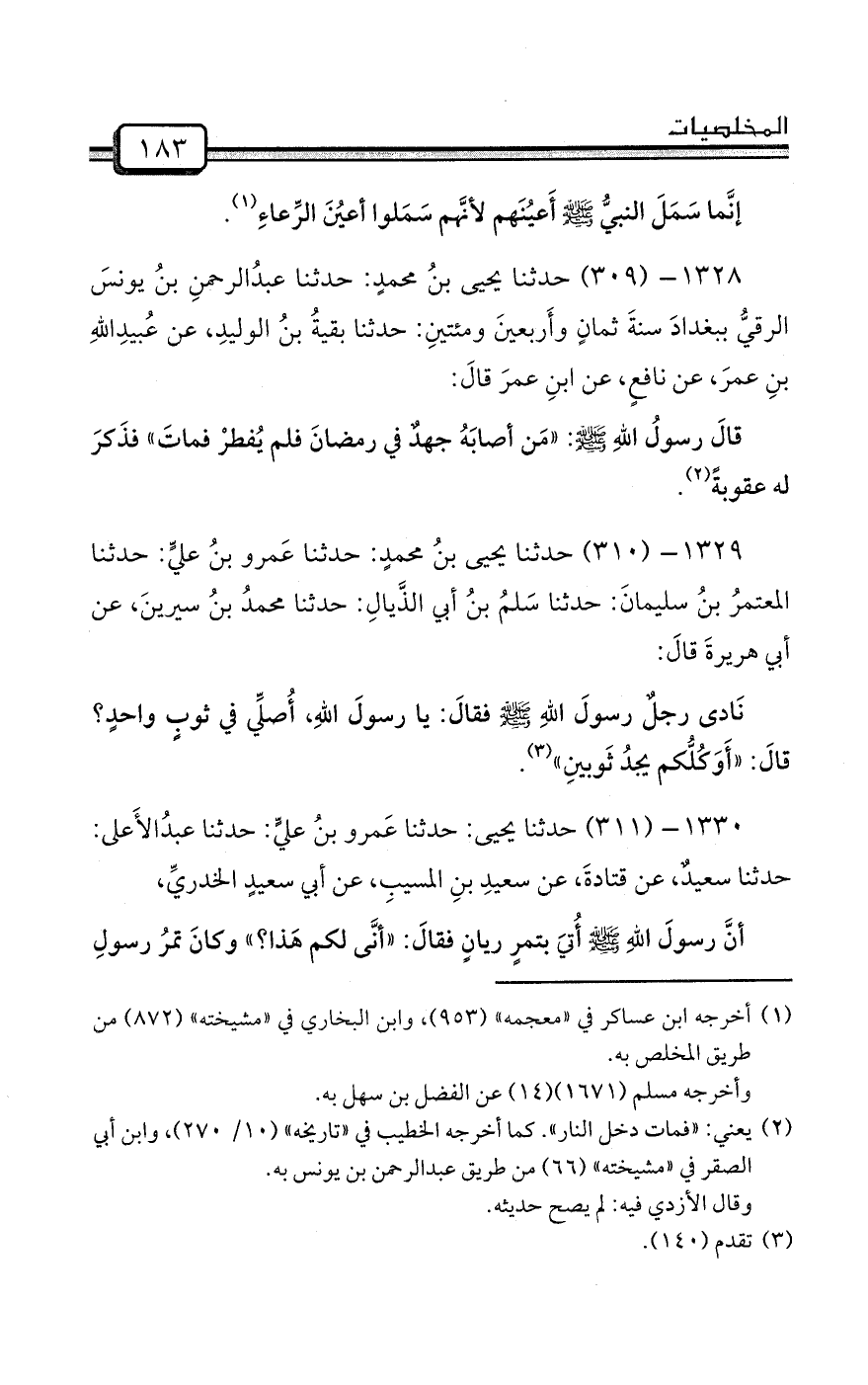 1329- (310) حدثنا يحيى بنُ محمدٍ: حدثنا عَمرو بنُ عليٍّ: حدثنا المعتمرُ بنُ سليمانَ: حدثنا سَلمُ بنُ أبي الذَّيالِ: حدثنا محمدُ بنُ سيرينَ، عن أبي هريرةَ قالَ: