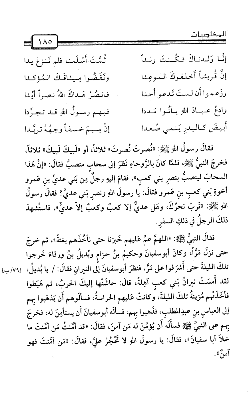 فقالَ رسولُ اللهِ صلى الله عليه وسلم: «نُصرتَ نُصرتَ» ثلاثاً، أو «لَبيكَ لَبيكَ» ثلاثاً، فخرجَ النبيُّ صلى الله عليه وسلم، فلمَّا كانَ بالرَّوحاءِ نَظرَ إلى سحابٍ منصبٍّ فقالَ: «إنَّ هَذا السحابَ لينصبُّ بنصرِ بني كعبٍ» ، فقامَ إليهِ رجلٌ مِن بَني عديِّ بنِ عَمرو أخوةِ بَني كعبِ بنِ عَمرو فقالَ: يا رسولَ اللهِ ونصرِ بَني عديٍّ؟ فقالَ رسولُ اللهِ صلى الله عليه وسلم: «تَربَ نحرُكَ، وهَل عديٌّ إلا كعبٌ وكعبٌ إلاّ عديٌّ» ، فاستُشهدَ ذلكَ الرجلُ في ذلكِ السفرِ.