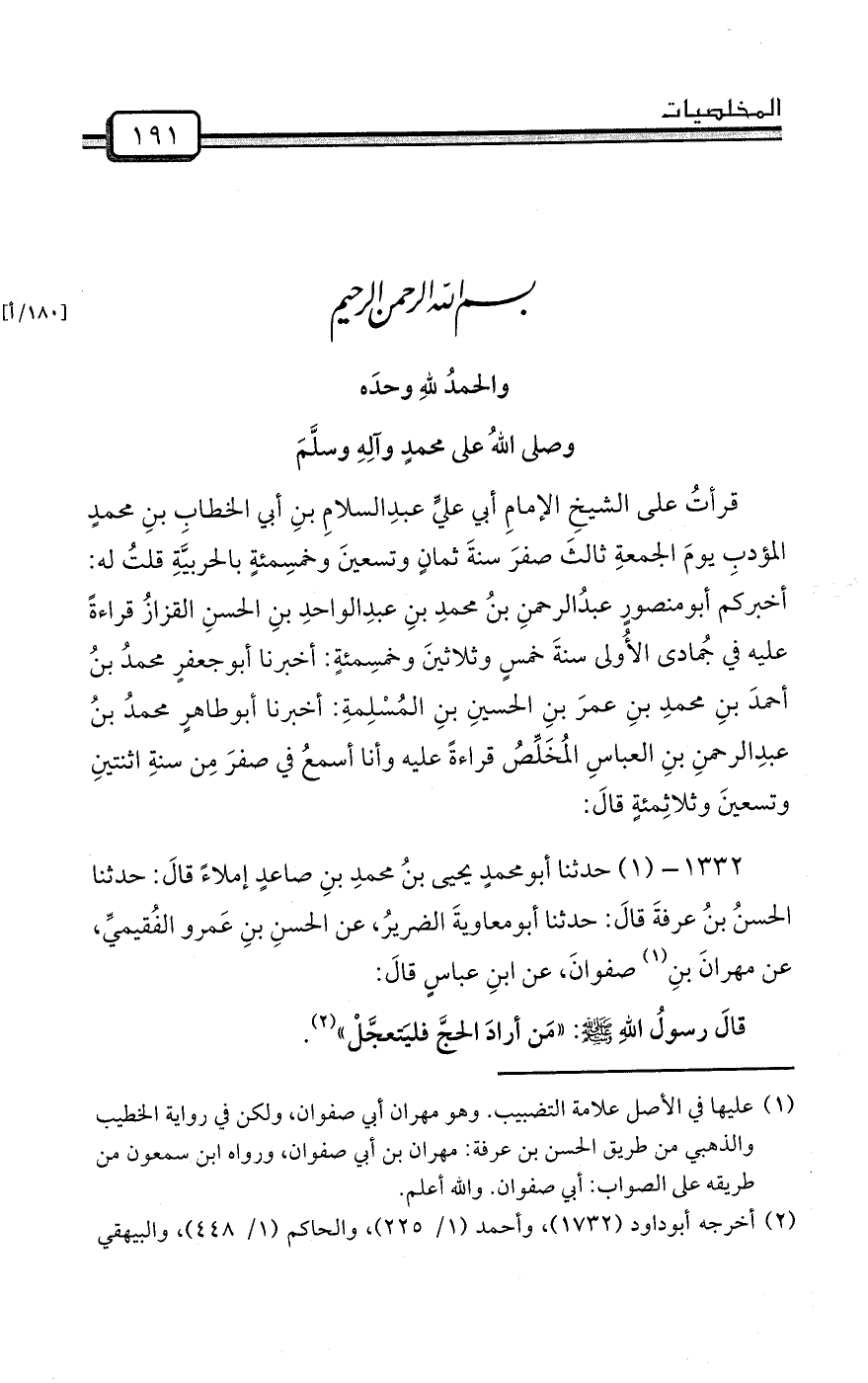 قرأتُ على الشيخِ الإمامِ أبي عليٍّ عبدِالسلامِ بنِ أبي الخطابِ بنِ محمدٍ المؤدبِ يومَ الجمعةِ ثالثَ صفرَ سنةَ ثمانٍ وتسعينَ وخمسِمئةٍ بالحربيَّةِ قلتُ له: أخبركم أبومنصورٍ عبدُالرحمنِ بنُ محمدِ بنِ عبدِالواحدِ بنِ الحسنِ القزازُ قراءةً عليه في جُمادى الأُولى سنةَ خمسٍ وثلاثينَ وخمسِمئةٍ: أخبرنا أبوجعفرٍ محمدُ بنُ أحمدَ بنِ محمدِ بنِ عمرَ بنِ الحسينِ بنِ المُسْلِمةِ: أخبرنا أبوطاهرٍ محمدُ بنُ عبدِالرحمنِ بنِ العباسِ المُخَلِّصُ قراءةً عليه وأنا أسمعُ في صفرَ مِن سنةِ اثنتينِ وتسعينَ وثلاثِمئةٍ قالَ: