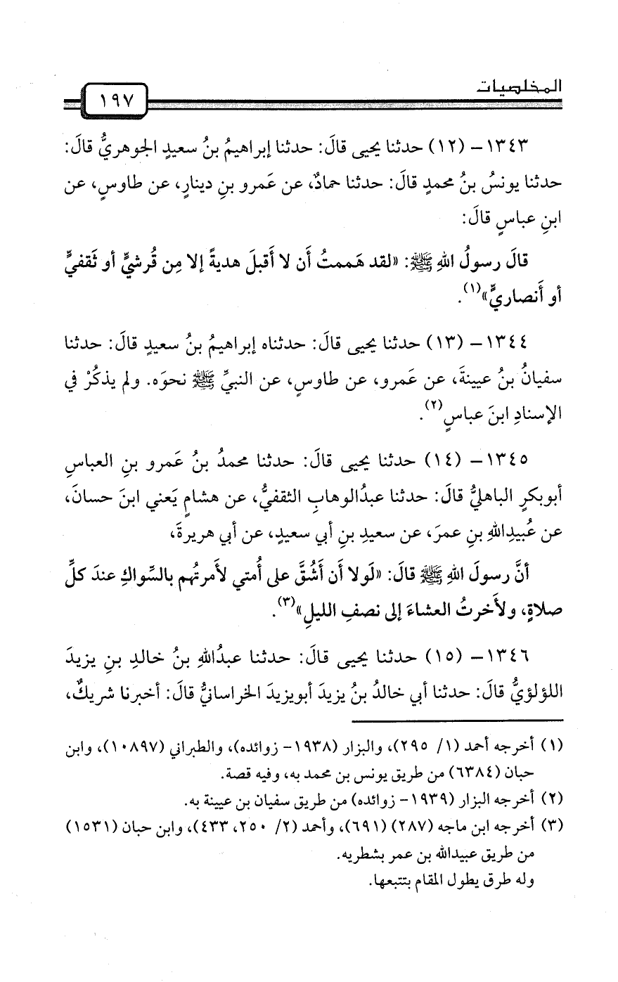 1343- (12) حدثنا يحيى قالَ: حدثنا إبراهيمُ بنُ سعيدٍ الجوهريُّ قالَ: حدثنا يونسُ بنُ محمدٍ قالَ: حدثنا حمادٌ، عن عَمرو بنِ دينارٍ، عن طاوسٍ، عن ابنِ عباسٍ قالَ: