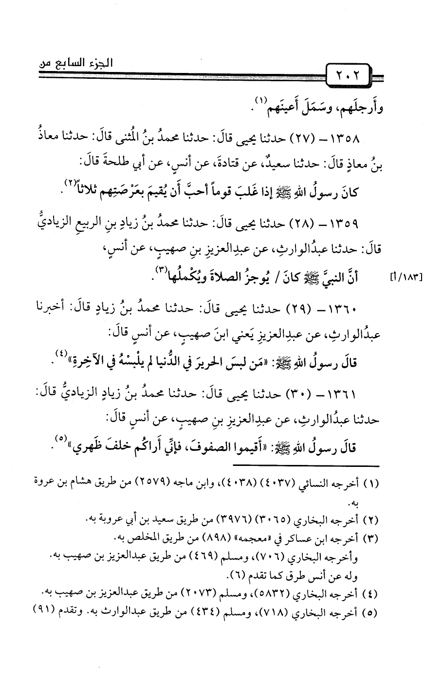 1360- (29) حدثنا يحيى قالَ: حدثنا محمدُ بنُ زيادٍ قالَ: أخبرنا عبدُالوارثِ، عن عبدِالعزيزِ يَعني ابنَ صهيبٍ، عن أنسٍ قالَ: