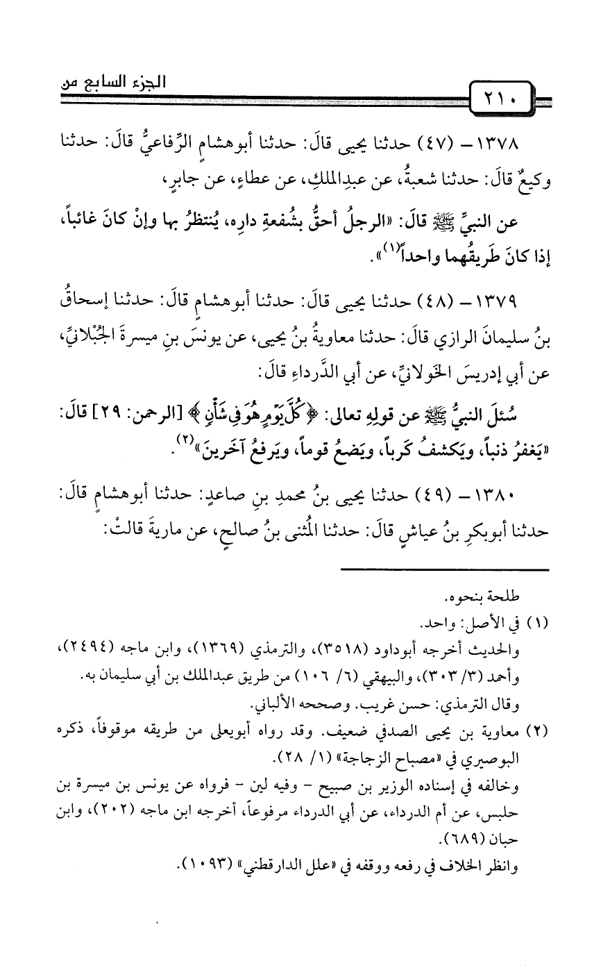 1378- (47) حدثنا يحيى قالَ: حدثنا أبوهشامٍ الرِّفاعيُّ قالَ: حدثنا وكيعٌ قالَ: حدثنا شعبةُ، عن عبدِالملكِ، عن عطاءٍ، عن جابرٍ،