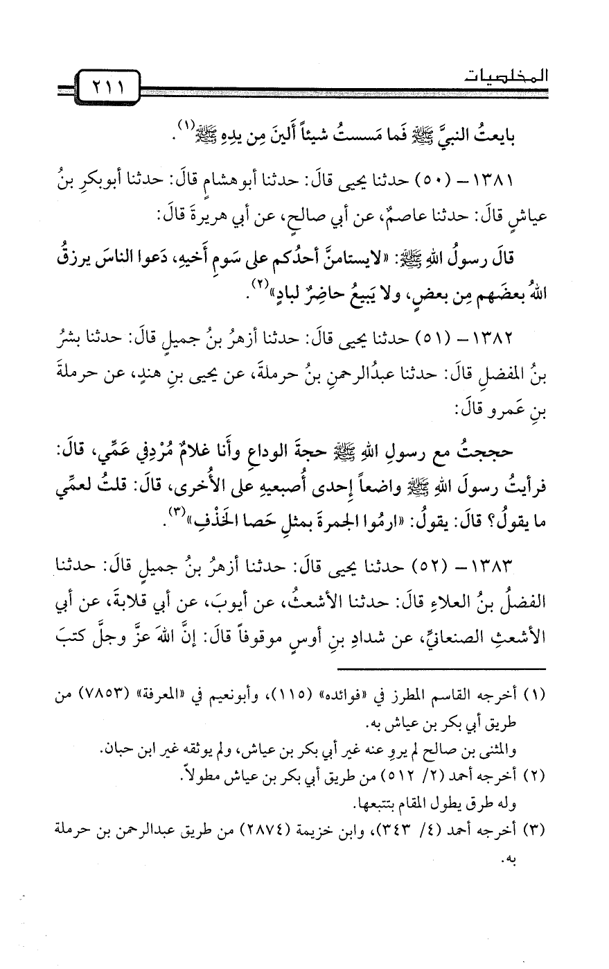 1382- (51) حدثنا يحيى قالَ: حدثنا أزهرُ بنُ جميلٍ قالَ: حدثنا بشرُ بنُ المفضلِ قالَ: حدثنا عبدُالرحمنِ بنُ حرملةَ، عن يحيى بنِ هندٍ، عن حرملةَ بنِ عَمرو قالَ:
