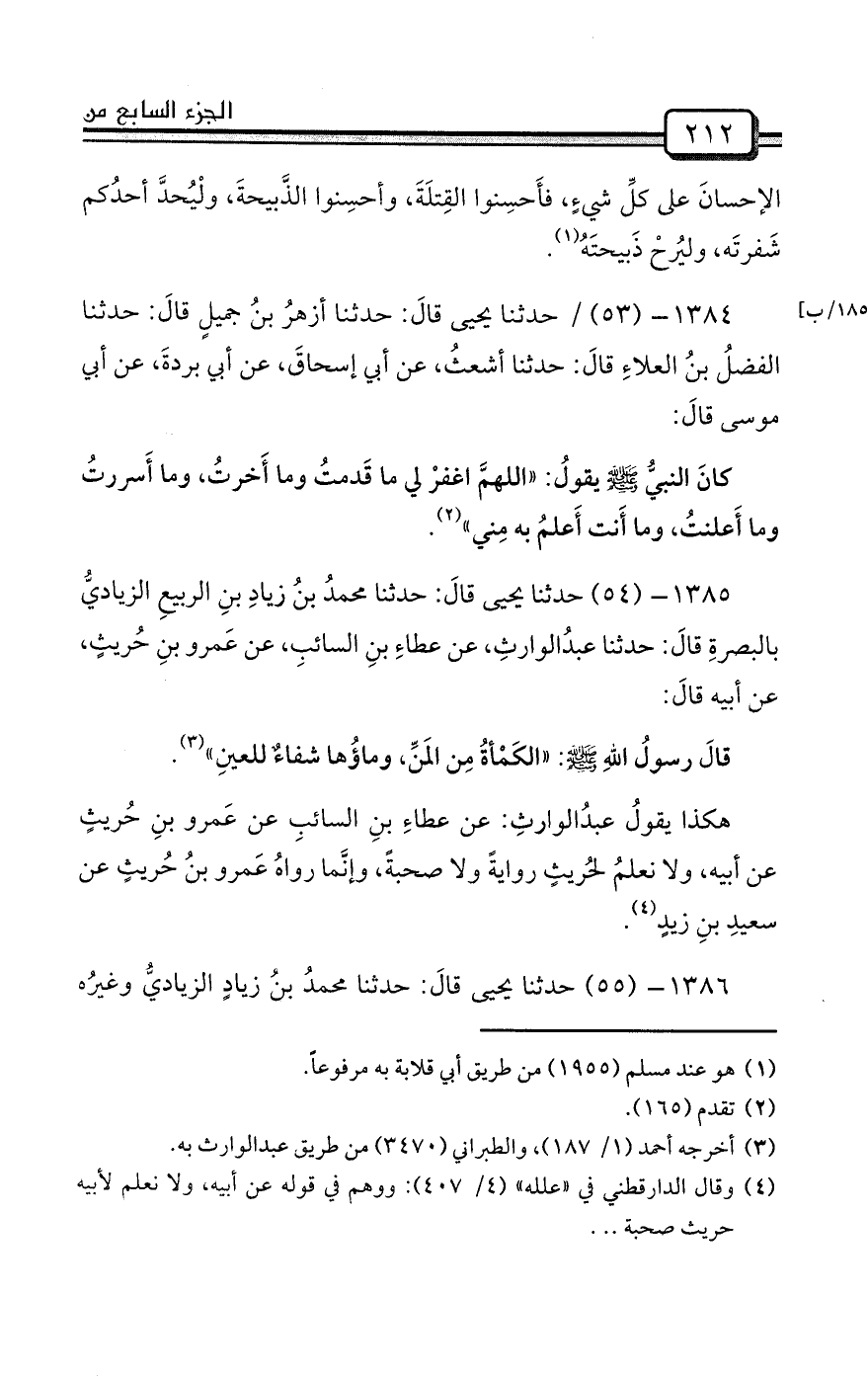 1385- (54) حدثنا يحيى قالَ: حدثنا محمدُ بنُ زيادِ بنِ الربيعِ الزياديُّ بالبصرةِ قالَ: حدثنا عبدُالوارثِ، عن عطاءِ بنِ السائبِ، عن عَمرو بنِ حُريثٍ، عن أبيه قالَ: