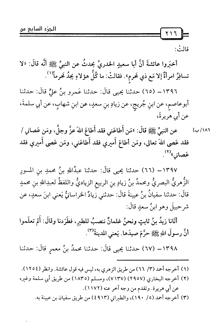1397- (66) حدثنا يحيى قالَ: حدثنا عبدُاللهِ بنُ محمدِ بنِ المسورِ الزُّهريُّ البصريُّ ومحمدُ بنُ زيادِ بنِ الربيعِ الزياديُّ واللفظُ لعبدِاللهِ بنِ محمدٍ قالَ: حدثنا سفيانُ بنُ عيينةَ قالَ: حدثني زيادٌ الخراسانيُّ يَعني ابنَ سعدٍ، عن شرحبيلَ وهو ابنُ سعدٍ قالَ: