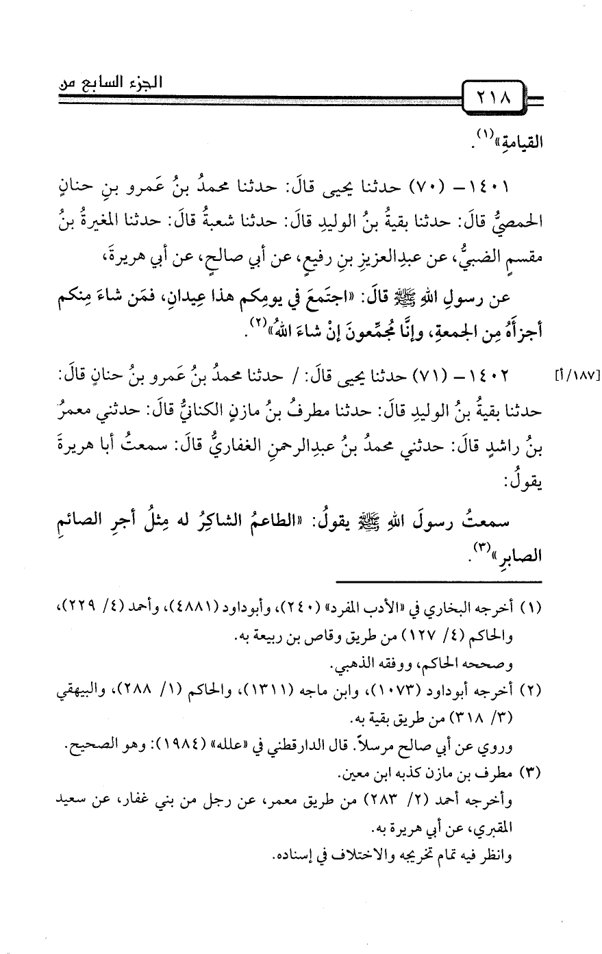 1402- (71) حدثنا يحيى قالَ: / حدثنا محمدُ بنُ عَمرو بنُ حنانٍ قالَ: حدثنا بقيةُ بنُ الوليدِ قالَ: حدثنا مطرفُ بنُ مازنٍ الكنانيُّ قالَ: حدثني معمرُ بنُ راشدٍ قالَ: حدثني محمدُ بنُ عبدِالرحمنِ الغفاريُّ قالَ: سمعتُ أبا هريرةَ يقولُ: