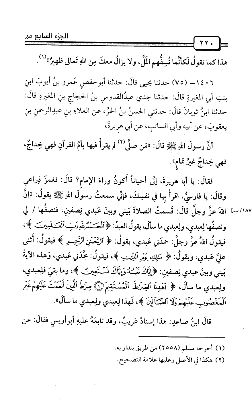 1406- (75) حدثنا يحيى قالَ: حدثنا أبوحفصٍ عَمرو بنُ أيوبَ ابنِ بنتِ أبي المغيرةِ قالَ: حدثنا جدي عبدُالقدوسِ بنُ الحجاجِ بنِ المغيرةِ قالَ: حدثنا ابنُ ثوبانَ قالَ: حدثني الحسنُ بنُ الحرِّ، عن العلاءِ بنِ عبدِالرحمنِ بنِ يعقوبَ، عن أبيه وأبي السائبِ، عن أبي هريرةَ،
