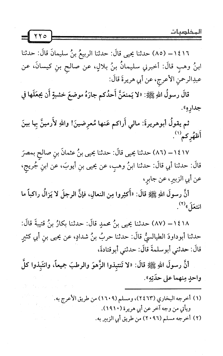 1416- (85) حدثنا يحيى قالَ: حدثنا الربيعُ بنُ سليمانَ قالَ: حدثنا ابنُ وهبٍ قالَ: أخبرني سليمانُ بنُ بلالٍ، عن صالحِ بنِ كيسانَ، عن عبدِالرحمنِ الأعرجِ، عن أبي هريرةَ قالَ: