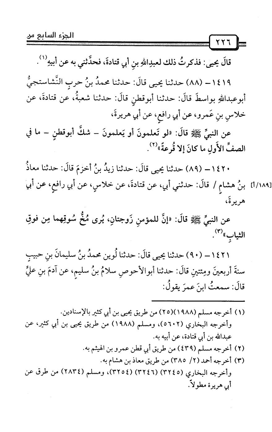 1420- (89) حدثنا يحيى قالَ: حدثنا زيدُ بنُ أخزمَ قالَ: حدثنا معاذُ بنُ هشامٍ / قالَ: حدثني أبي، عن قتادةَ، عن خلاسٍ، عن أبي رافعٍ، عن أبي هريرةَ،