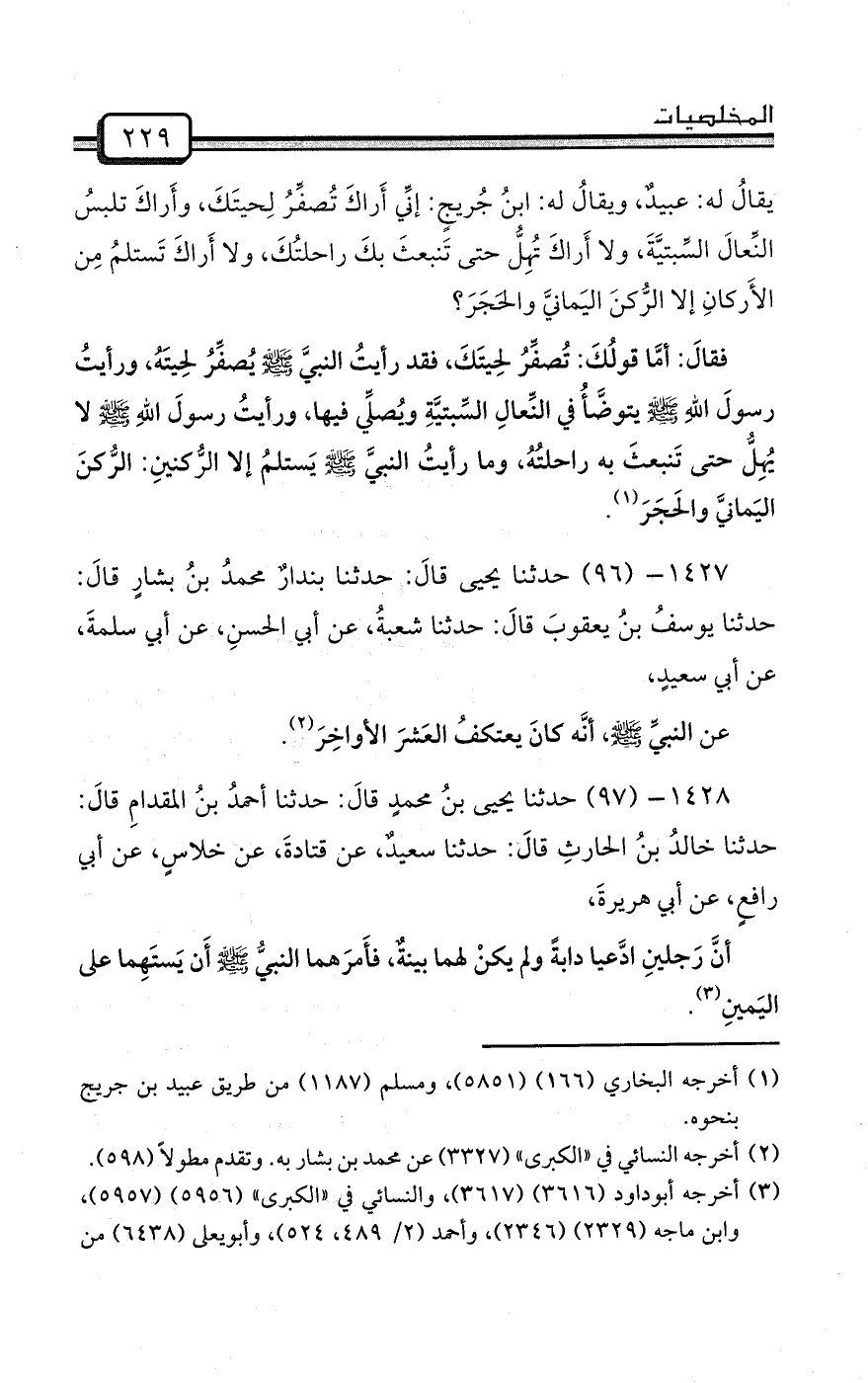فقالَ: أمَّا قولُكَ: تُصفِّرُ لِحيتَكَ، فقد رأيتُ النبيَّ صلى الله عليه وسلم يُصفِّرُ لِحيتَهُ، ورأيتُ رسولَ اللهِ صلى الله عليه وسلم يتوضَّأُ في النِّعالِ السِّبتيَّةِ ويُصلِّي فيها، ورأيتُ رسولَ اللهِ صلى الله عليه وسلم لا يُهِلُّ حتى تَنبعثَ به راحلتُهُ، وما رأيتُ النبيَّ صلى الله عليه وسلم يَستلمُ إلا الرُّكنينِ: الرُّكنَ اليَمانيَّ والحَجَرَ (¬1) .