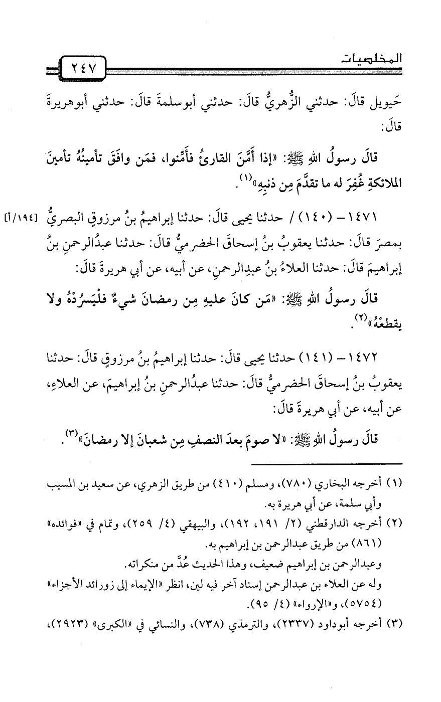 1471- (140) / حدثنا يحيى قالَ: حدثنا إبراهيمُ بنُ مرزوقٍ البصريُّ بمصرَ قالَ: حدثنا يعقوبُ بنُ إسحاقَ الحضرميُّ قالَ: حدثنا عبدُالرحمنِ بنُ إبراهيمَ قالَ: حدثنا العلاءُ بنُ عبدِالرحمنِ، عن أبيه، عن أبي هريرةَ قالَ: