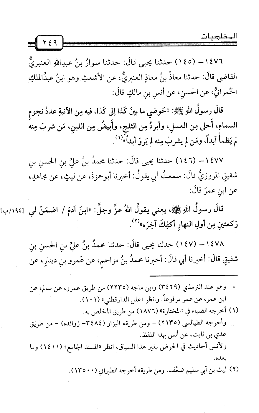 1476- (145) حدثنا يحيى قالَ: حدثنا سوارُ بنُ عبدِاللهِ العنبريُّ القاضي قالَ: حدثنا معاذُ بنُ معاذٍ العنبريُّ، عن الأشعثِ وهو ابنُ عبدُالملكِ الحُمرانيُّ، عن الحسنِ، عن أنسِ بنِ مالكٍ قالَ: