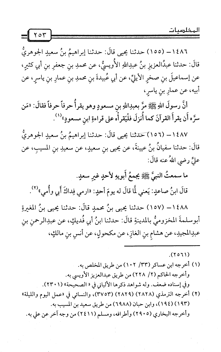 1488- (157) حدثنا يحيى بنُ محمدٍ قالَ: حدثنا يحيى بنُ المغيرةِ أبوسلمةَ المخزوميُّ بالمدينةِ قالَ: حدثنا ابنُ أبي فُديكٍ، عن عبدِالرحمنِ بنِ عبدِالمجيدِ، عن هشامِ بنِ الغازِ، عن مكحولٍ، عن أنسِ بنِ مالكٍ،
