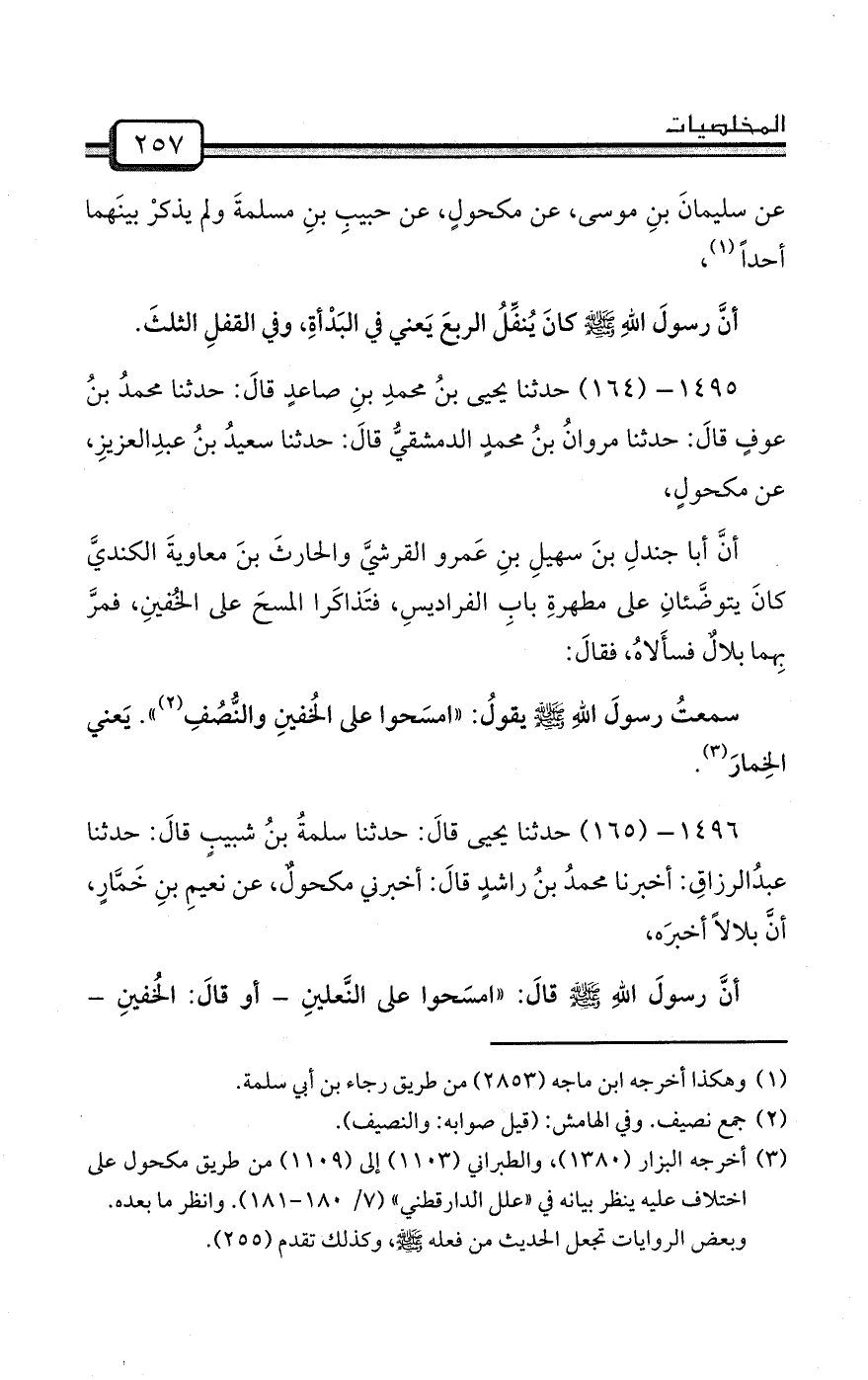 1496- (165) حدثنا يحيى قالَ: حدثنا سلمةُ بنُ شبيبٍ قالَ: حدثنا عبدُالرزاقِ: أخبرنا محمدُ بنُ راشدٍ قالَ: أخبرني مكحولٌ، عن نعيمِ بنِ خَمَّارٍ، أنَّ بلالاً أخبرَه،