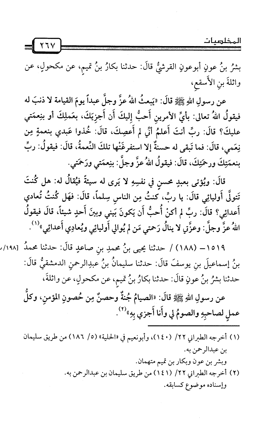 1519- (188) / حدثنا يحيى بنُ محمدِ بنِ صاعدٍ قالَ: حدثنا محمدُ بنُ إسماعيلَ بنِ يوسفَ قالَ: حدثنا سليمانُ بنُ عبدِالرحمنِ الدمشقيُّ قالَ: حدثنا بشرُ بنُ عونٍ قالَ: حدثنا بكارُ بنُ تميمٍ، عن مكحولٍ، عن واثلةَ،