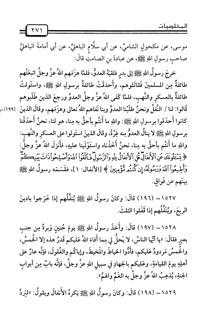 1529- (198) قالَ: وكانَ رسولُ اللهِ صلى الله عليه وسلم يَكرهُ الأَنفالَ ويقولُ: «ليَردَّ