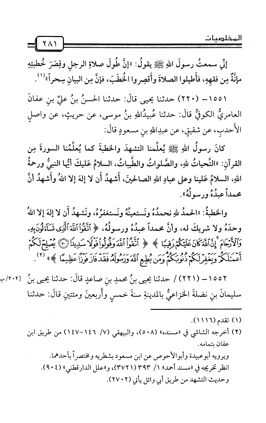 كانَ رسولُ اللهِ صلى الله عليه وسلم يُعلِّمنا التشهدَ والخطبةَ كما يُعلِّمُنا السورةَ مِن القرآنِ: «التَّحياتُ للهِ، والصَّلواتُ والطَّيباتُ، السلامُ عَليكَ أيُّها النبيُّ ورحمةُ اللهِ، السلامُ عَلينا وعلى عبادِ اللهِ الصالحينَ، أَشهدُ أَن لا إلهَ إلا اللهُ وأَشهدُ أنَّ محمداً عبدُهُ ورسولُهُ» .