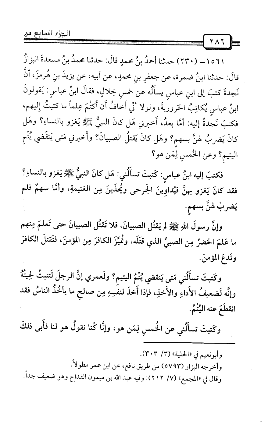 1561- (230) حدثنا أحمدُ بنُ محمدٍ قالَ: حدثنا محمدُ بنُ مسعدةَ البزازُ قالَ: حدثنا ابنُ ضمرة، عن جعفرِ بنِ محمدٍ، عن أبيه، عن يزيدَ بنِ هُرمزَ، أنَّ نَجدةَ كتبَ إلى ابنِ عباسٍ يسأَلُه عن خمسِ خِلالٍ، فقالَ ابنُ عباسٍ: يَقولونَ ابنُ عباسٍ يُكاتِبُ الحَروريةَ، ولولا أنِّي أَخافُ أَن أَكتُمَ عِلماً ما كتبتُ إِليهم، فكتبَ نَجدةُ إليه: أمَّا بعدُ، أَخبرني هَل كانَ النبيُّ صلى الله عليه وسلم يَغزو بالنساءِ؟ وهَل كانَ يَضربُ لهنَّ بسهمٍ؟ وهَل كانَ يَقتلُ الصبيانَ؟ وأَخبرني مَتى يَنقَضي يُتْمِ اليتيمِ؟ وعن الخُمسِ لِمَن هو؟