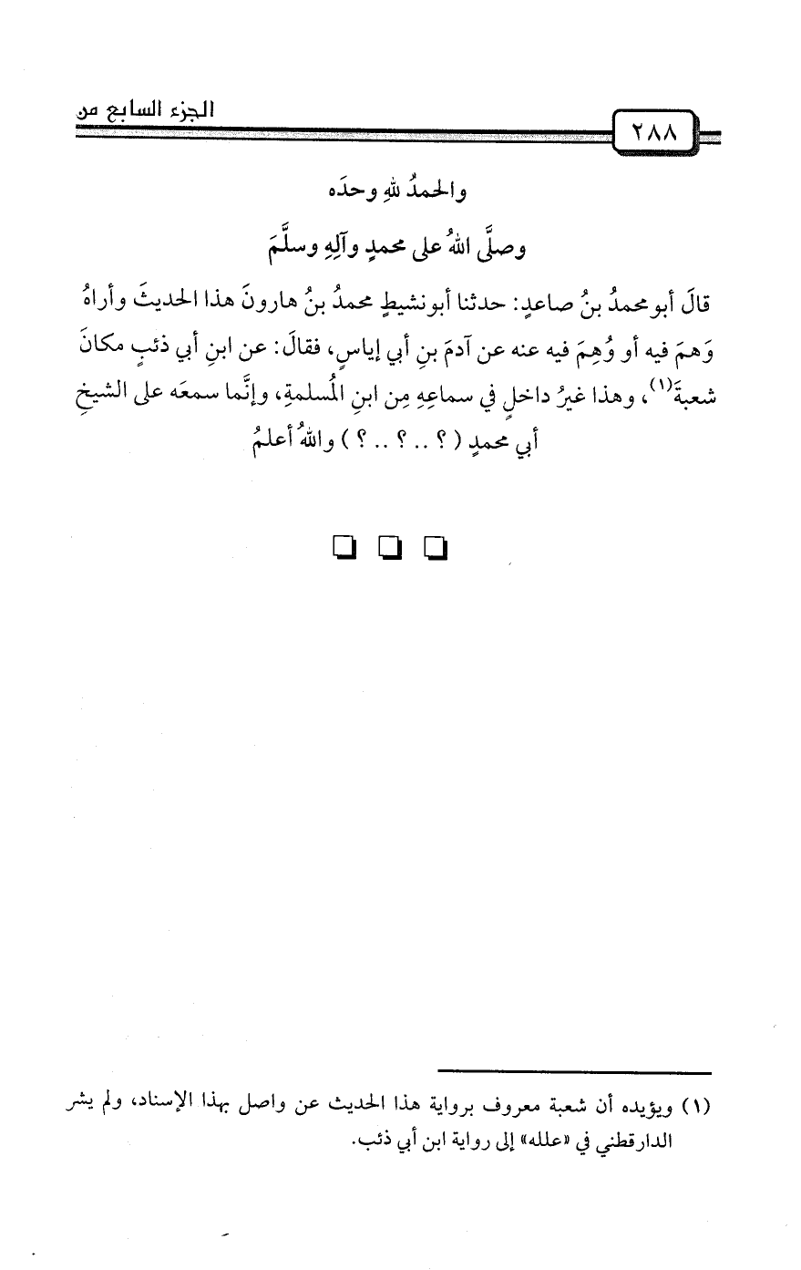قالَ أبومحمدُ بنُ صاعدٍ: حدثنا أبونشيطٍ محمدُ بنُ هارونَ هذا الحديثَ وأراهُ وَهمَ فيه أو وُهِمَ فيه عنه عن آدمَ بنِ أبي إياسٍ، فقالَ: عن ابنِ أبي ذئبٍ مكانَ شعبةَ (¬1) ، وهذا غيرُ داخلٍ في سماعِهِ مِن ابنِ المُسلمةِ، وإنَّما سمعَه على الشيخِ أبي محمدٍ (؟..؟..؟) واللهُ أعلمُ
