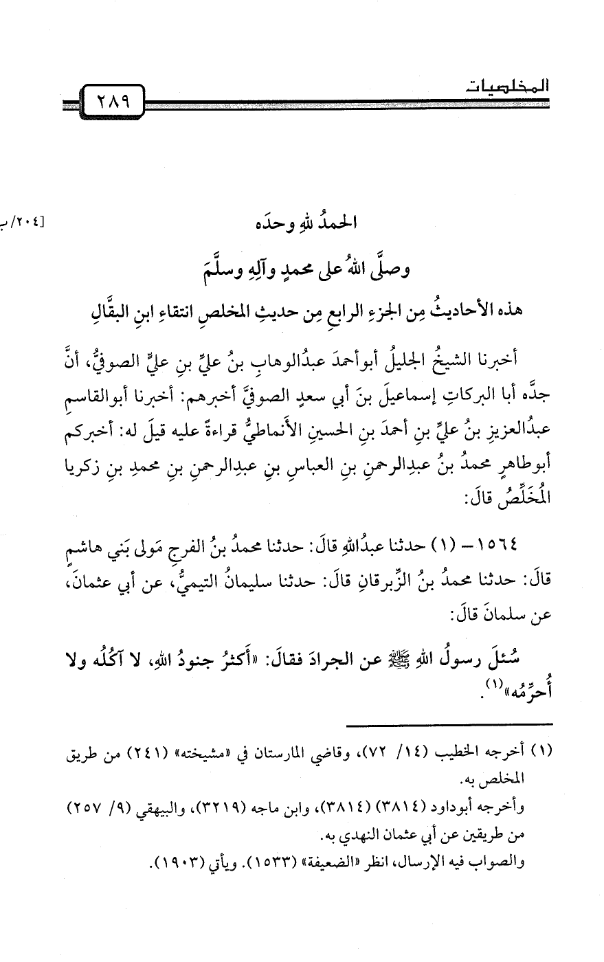 أخبرنا الشيخُ الجليلُ أبوأحمدَ عبدُالوهابِ بنُ عليِّ بنِ عليٍّ الصوفيُّ، أنَّ جدَّه أبا البركاتِ إسماعيلَ بنَ أبي سعدٍ الصوفيَّ أخبرهم: أخبرنا أبوالقاسمِ عبدُالعزيزِ بنُ عليِّ بنِ أحمدَ بنِ الحسينِ الأَنماطيُّ قراءةً عليه قيلَ له: (أخبركم؟) أبوطاهرٍ محمدُ بنُ عبدِالرحمنِ بنِ العباسِ بنِ عبدِالرحمنِ بنِ محمدِ بنِ زكريا المُخَلِّصُ قالَ: