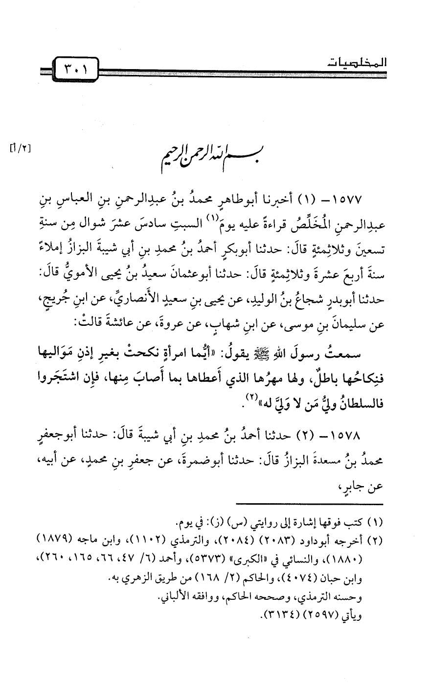 1577- (1) أخبرنا أبوطاهرٍ محمدُ بنُ عبدِالرحمنِ بنِ العباسِ بنِ عبدِالرحمنِ المُخَلِّصُ قراءةً عليه يومَ (¬1) السبتِ سادسَ عشرَ شوال مِن سنةِ تسعينَ وثلاثِمئةٍ قالَ: حدثنا أبوبكرٍ أحمدُ بنُ محمدِ بنِ أبي شيبةَ البزازُ إملاءً سنةَ أربعَ عشرةَ وثلاثِمئةٍ قالَ: حدثنا أبوعثمانَ سعيدُ بنُ يحيى الأمويُّ قالَ: حدثنا أبوبدرٍ شجاعُ بنُ الوليدِ، عن يحيى بنِ سعيدٍ الأَنصاريِّ، عن ابنِ جُريجٍ، عن سليمانَ بنِ موسى، عن ابنِ شهابٍ، عن عروةَ، عن عائشةَ قالتْ: