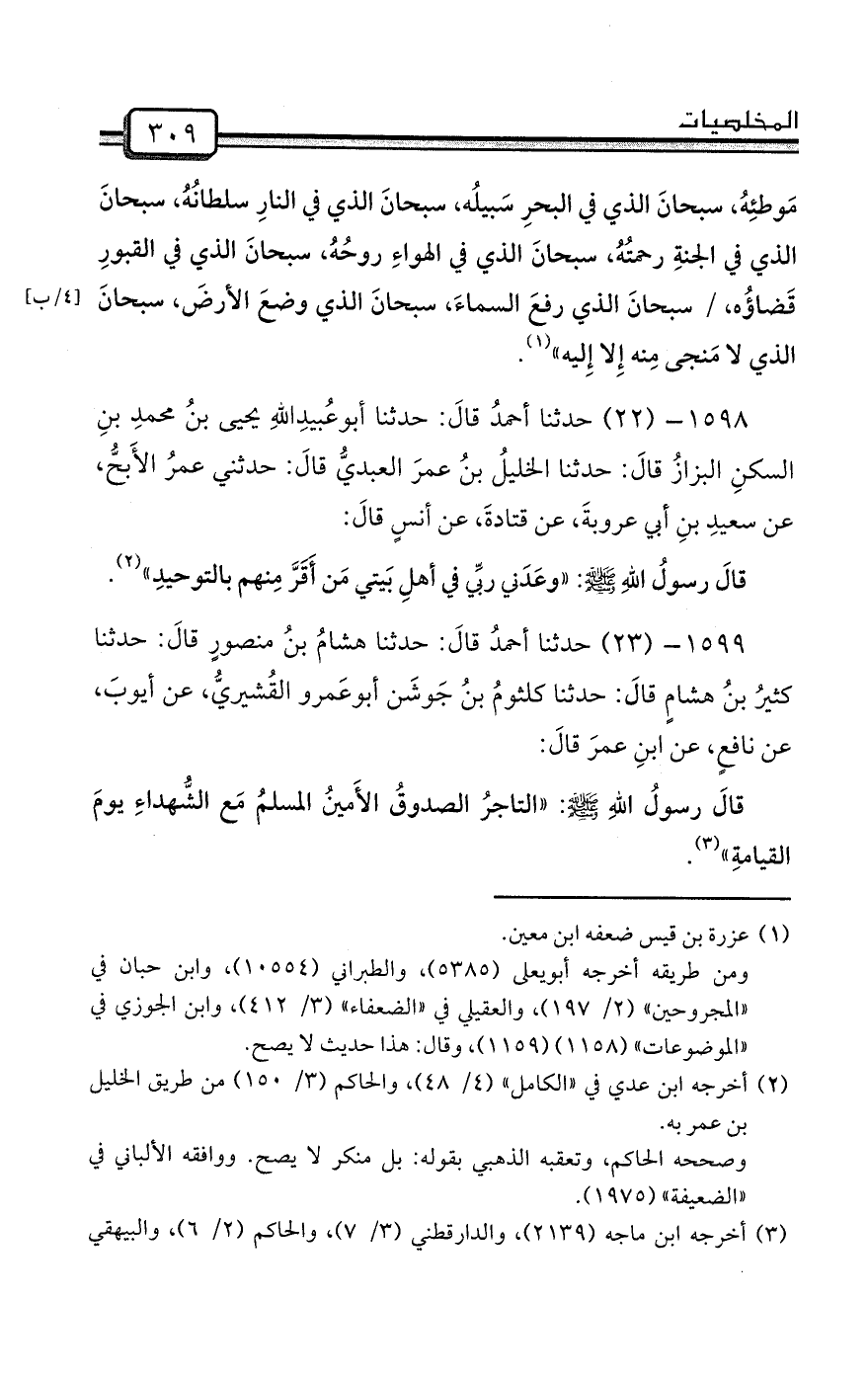 1599- (23) حدثنا أحمدُ قالَ: حدثنا هشامُ بنُ منصورٍ قالَ: حدثنا كثيرُ بنُ هشامٍ قالَ: حدثنا كلثومُ بنُ جَوشَن أبوعَمرو القُشيريُّ، عن أيوبَ، عن نافعٍ، عن ابنِ عمرَ قالَ:
