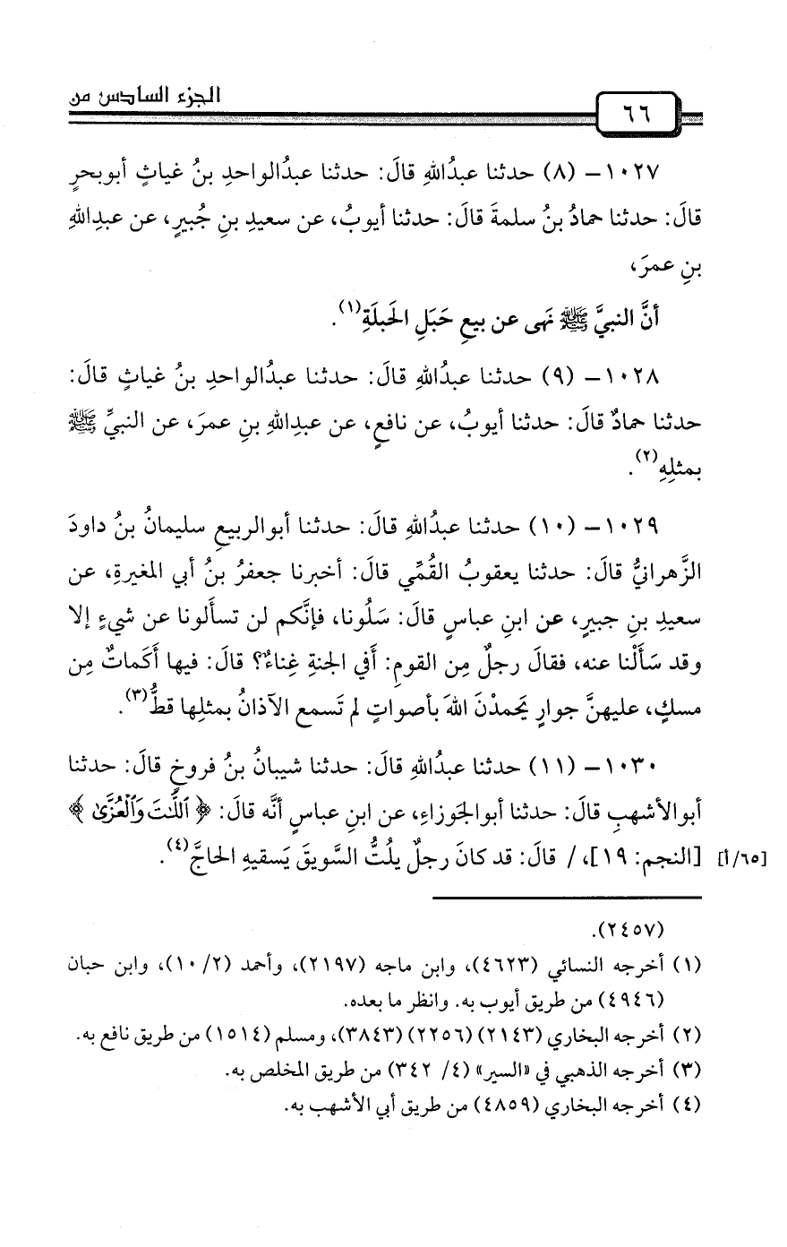 1027- (8) حدثنا عبدُاللهِ قالَ: حدثنا عبدُالواحدِ بنُ غياثٍ أبوبحرٍ قالَ: حدثنا حمادُ بنُ سلمةَ قالَ: حدثنا أيوبُ، عن سعيدِ بنِ جُبيرٍ، عن عبدِاللهِ بنِ عمرَ،