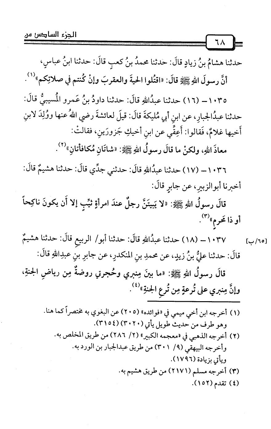 1036- (17) حدثنا عبدُاللهِ قالَ: حدثني جدِّي قالَ: حدثنا هشيمٌ قالَ: أخبرنا أبوالزبيرِ، عن جابرٍ قالَ: