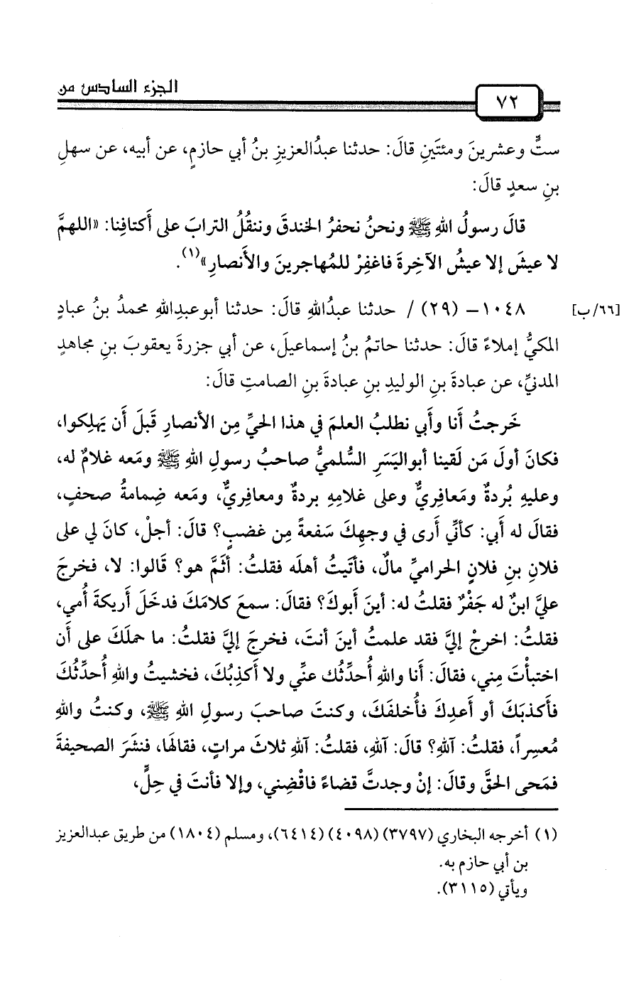 1048- (29) / حدثنا عبدُاللهِ قالَ: حدثنا أبوعبدِاللهِ محمدُ بنُ عبادٍ المكيُّ إملاءً قالَ: حدثنا حاتمُ بنُ إسماعيلَ، عن أبي جزرةَ يعقوبَ بنِ مجاهدٍ المدنيِّ، عن عبادةَ بنِ الوليدِ بنِ عبادةَ بنِ الصامتِ قالَ: