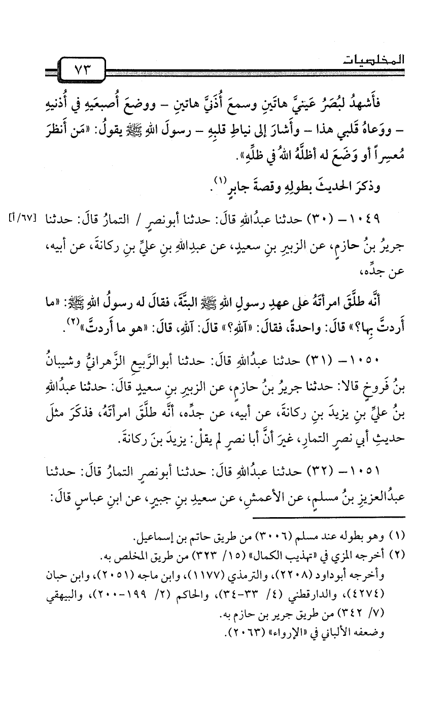 1050- (31) حدثنا عبدُاللهِ قالَ: حدثنا أبوالرَّبيعِ الزَّهرانيُّ وشيبانُ بنُ فَروخٍ قالا: حدثنا جريرُ بنُ حازمٍ، عن الزبيرِ بنِ سعيدٍ قالَ: حدثنا عبدُاللهِ بنُ عليِّ بنِ يزيدَ بنِ ركانةَ، عن أبيه، عن جدِّه، أنَّه طلَّقَ امرأتَهُ، فذكَرَ مثلَ حديثِ أبي نصرٍ التمارِ، غيرَ أنَّ أبا نصرٍ لم يقلْ: يزيدَ بنَ ركانةَ.