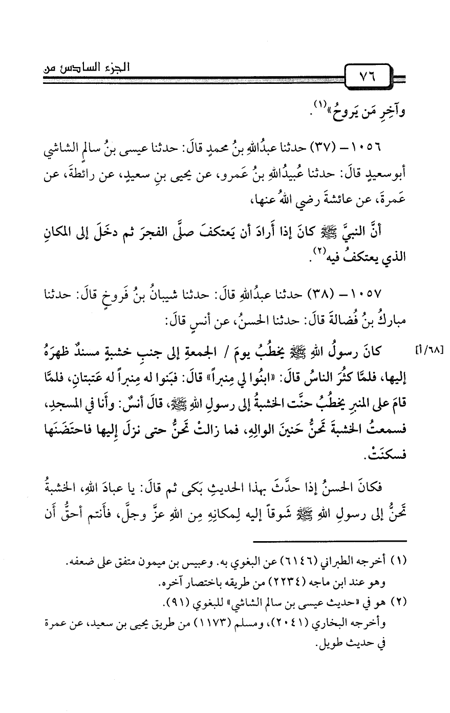 فكانَ الحسنُ إذا حدَّثَ بهذا الحديثِ بَكى ثم قالَ: يا عبادَ اللهِ، الخشبةُ تَحنُّ إلى رسولِ اللهِ صلى الله عليه وسلم شَوقاً إليه لِمكانِهِ مِن اللهِ عزَّ وجلَّ، فأَنتم أحقُّ أَن