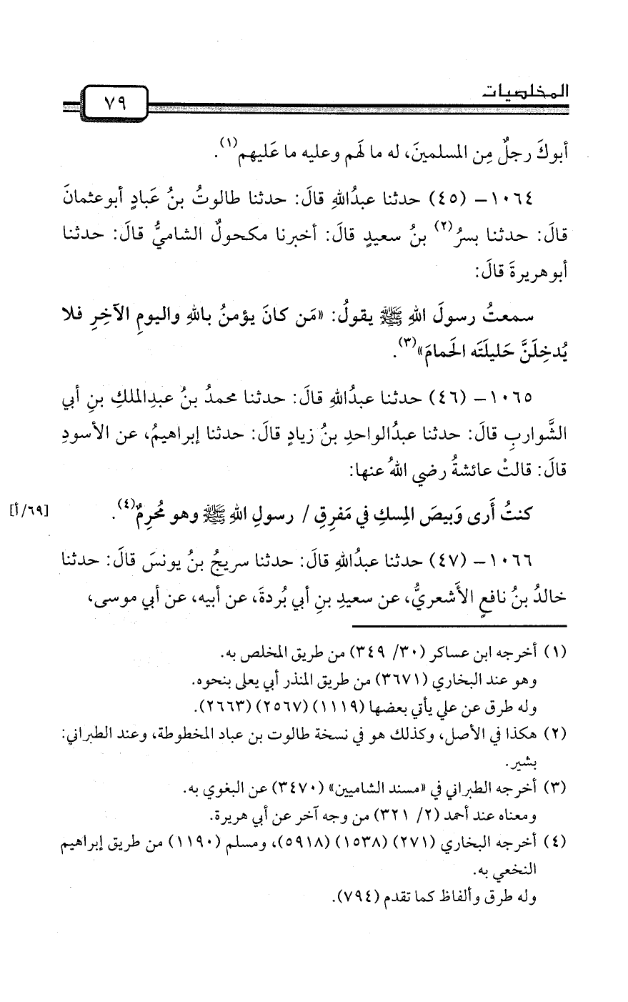 1064- (45) حدثنا عبدُاللهِ قالَ: حدثنا طالوتُ بنُ عَبادٍ أبوعثمانَ قالَ: حدثنا بسرُ (¬2) بنُ سعيدٍ قالَ: أخبرنا مكحولٌ الشاميُّ قالَ: حدثنا أبوهريرةَ قالَ: