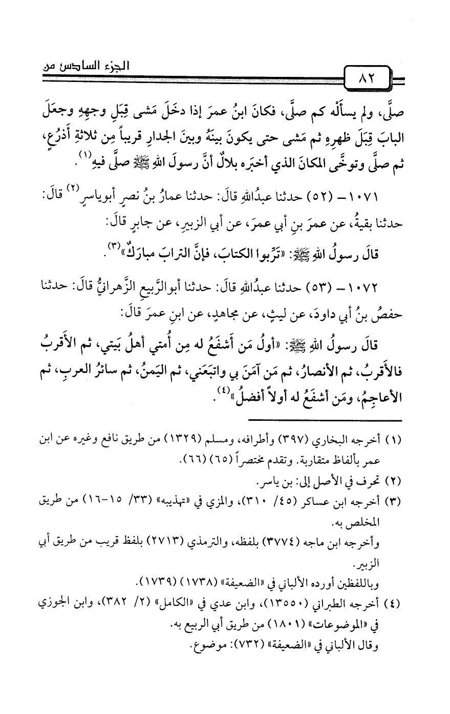 1071- (52) حدثنا عبدُاللهِ قالَ: حدثنا عمارُ بنُ نصرٍ أبوياسرٍ (¬2) قالَ: حدثنا بقيةُ، عن عمرَ بنِ أبي عمرَ، عن أبي الزبيرِ، عن جابرٍ قالَ: