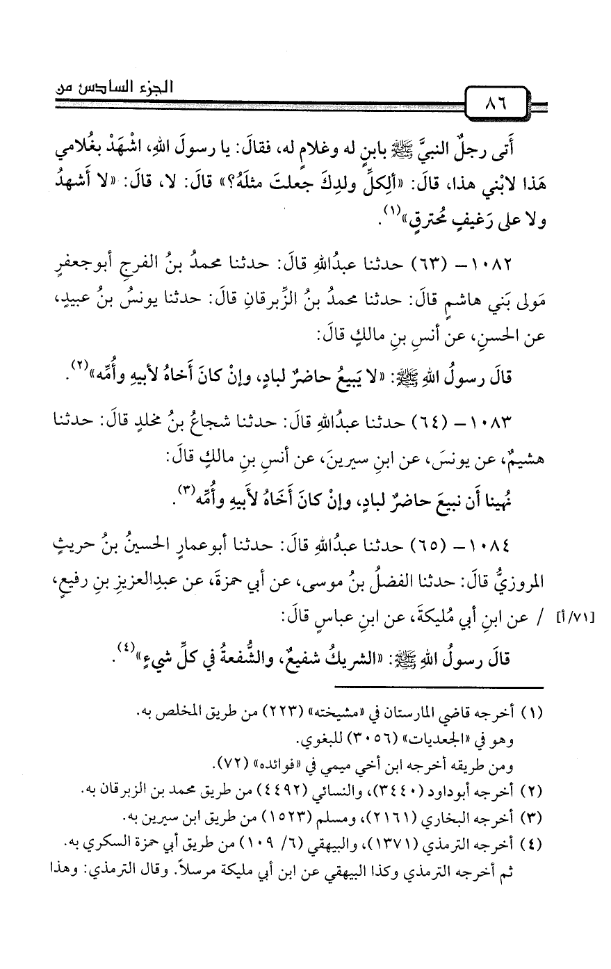 1082- (63) حدثنا عبدُاللهِ قالَ: حدثنا محمدُ بنُ الفرجِ أبوجعفرٍ مَولى بَني هاشمٍ قالَ: حدثنا محمدُ بنُ الزِّبرقانِ قالَ: حدثنا يونسُ بنُ عبيدٍ، عن الحسنِ، عن أنسِ بنِ مالكٍ قالَ: