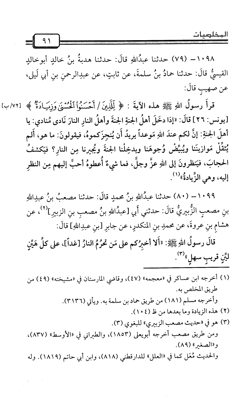 1098- (79) حدثنا عبدُاللهِ قالَ: حدثنا هدبةُ بنُ خالدٍ أبوخالدٍ القيسيُّ قالَ: حدثنا حمادُ بنُ سلمةَ، عن ثابتٍ، عن عبدِالرحمنِ بنِ أبي لَيلى، عن صهيبٍ قالَ: