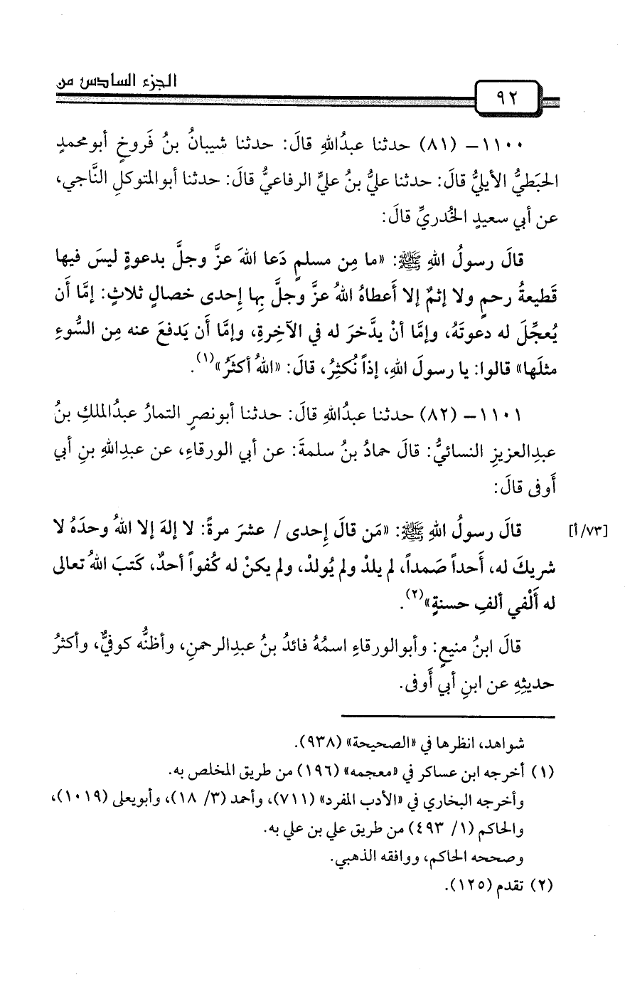1101- (82) حدثنا عبدُاللهِ قالَ: حدثنا أبونصرٍ التمارُ عبدُالملكِ بنُ عبدِالعزيزِ النسائيُّ: قالَ حمادُ بنُ سلمةَ: عن أبي الورقاءِ، عن عبدِاللهِ بنِ أبي أَوفى قالَ: