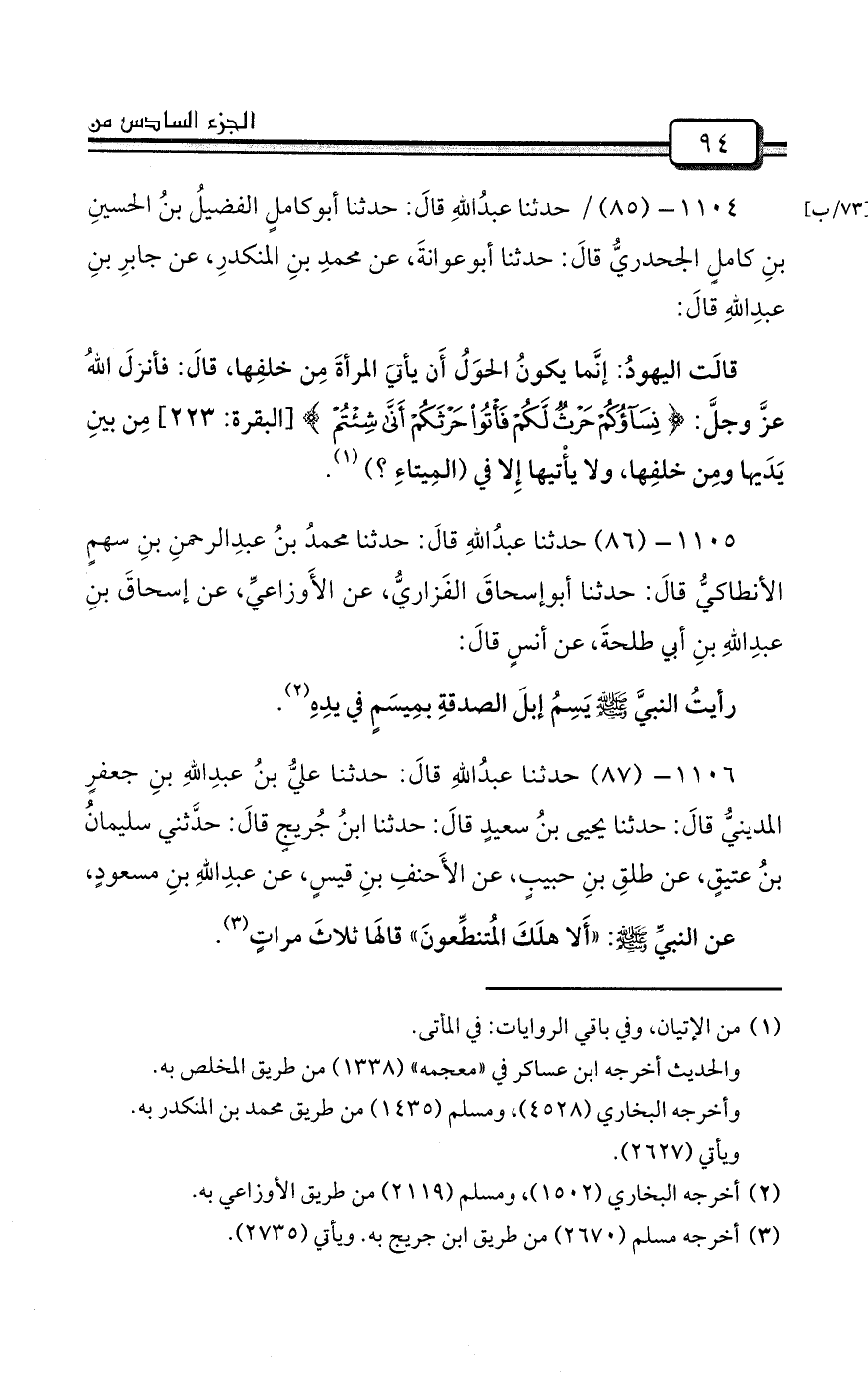 1104- (85) / حدثنا عبدُاللهِ قالَ: حدثنا أبوكاملٍ الفضيلُ بنُ الحسينِ بنِ كاملٍ الجحدريُّ قالَ: حدثنا أبوعوانةَ، عن محمدِ بنِ المنكدرِ، عن جابرِ بنِ عبدِاللهِ قالَ: