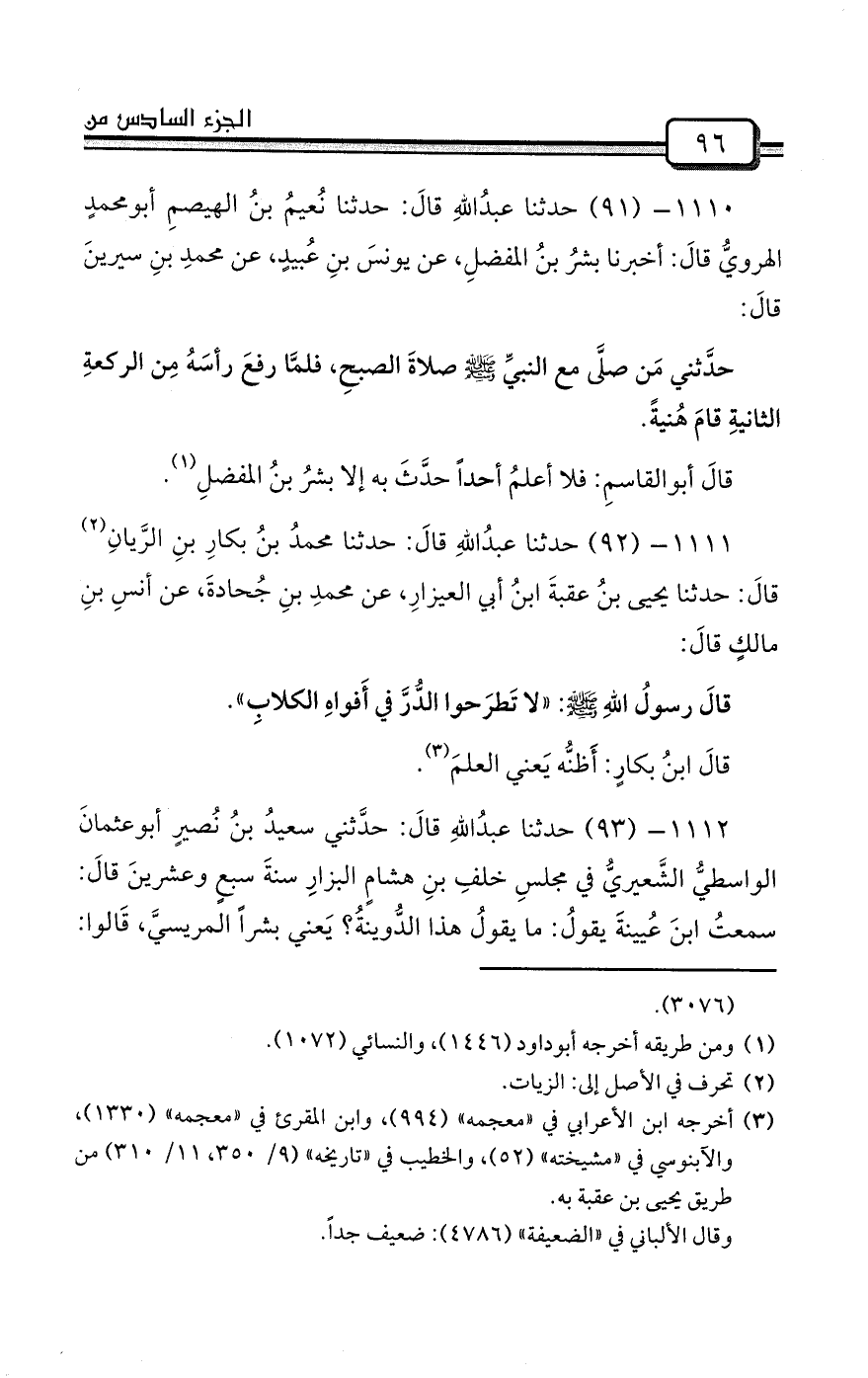 1110- (91) حدثنا عبدُاللهِ قالَ: حدثنا نُعيمُ بنُ الهيصمِ أبومحمدٍ الهرويُّ قالَ: أخبرنا بشرُ بنُ المفضلِ، عن يونسَ بنِ عُبيدٍ، عن محمدِ بنِ سيرينَ قالَ: