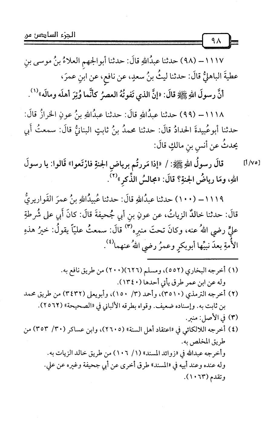 1117- (98) حدثنا عبدُاللهِ قالَ: حدثنا أبوالجهمِ العلاءُ بنُ موسى بنِ عطيةَ الباهليُّ قالَ: حدثنا ليثُ بنُ سعدٍ، عن نافعٍ، عن ابنِ عمرَ،
