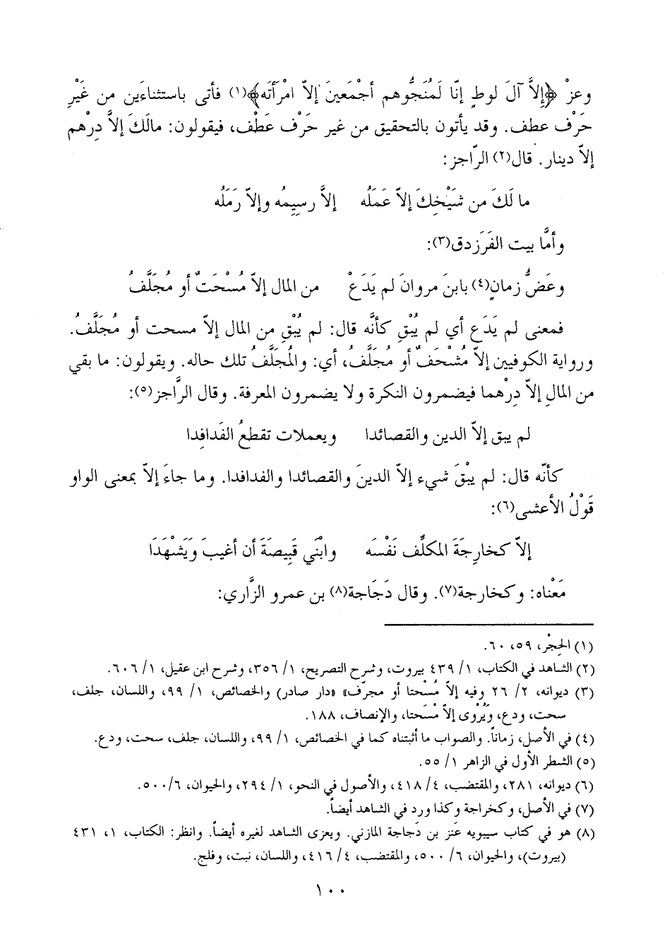 وعز {إِلاَّ آلَ لُوطٍ إِنَّا لَمُنَجُّوهُمْ أَجْمَعِينَ * إِلاَّ امْرَأَتَهُ} فأتى باستثناءين من غير حرف عطف. وقد يأتون بالتحقيق من غير حرف عطف، فيقولون: مالك إلا درهم إلا دينار. قال الراجز: