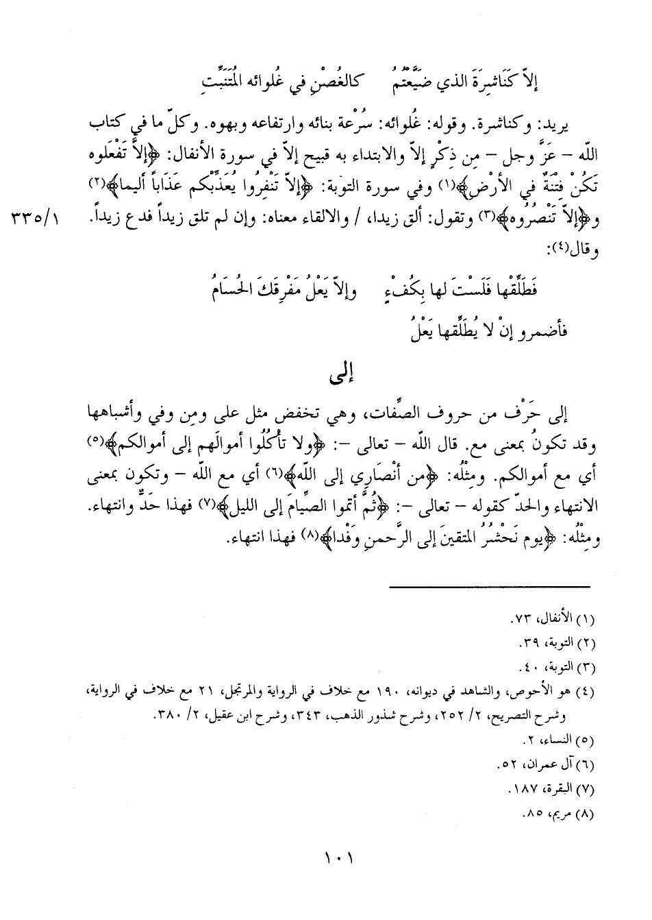 إلى حَرْف من حروف الصفات، وهي تخفض مثل على ومِن وفي وأشباهها وقد تكونُ بمعنى مع. قال الله - تعالى-: {وَلا تَاكُلُوا أَمْوَالَهُمْ إِلَى أَمْوَالِكُمْ} أي مع أموالكم. ومثله: {مَنْ أَنصَارِي إِلَى اللَّهِ} أي مع الله - وتكون بمعنى الانتهاء والحد كقوله - تعالى-: {ثُمَّ أَتِمُّوا الصِّيَامَ إِلَى اللَّيْلِ} فهذا حد وانتهاء. ومثله: {يَوْمَ نَحْشُرُ الْمُتَّقِينَ إِلَى الرَّحْمَنِ وَفْداً} فهذا انتهاء.