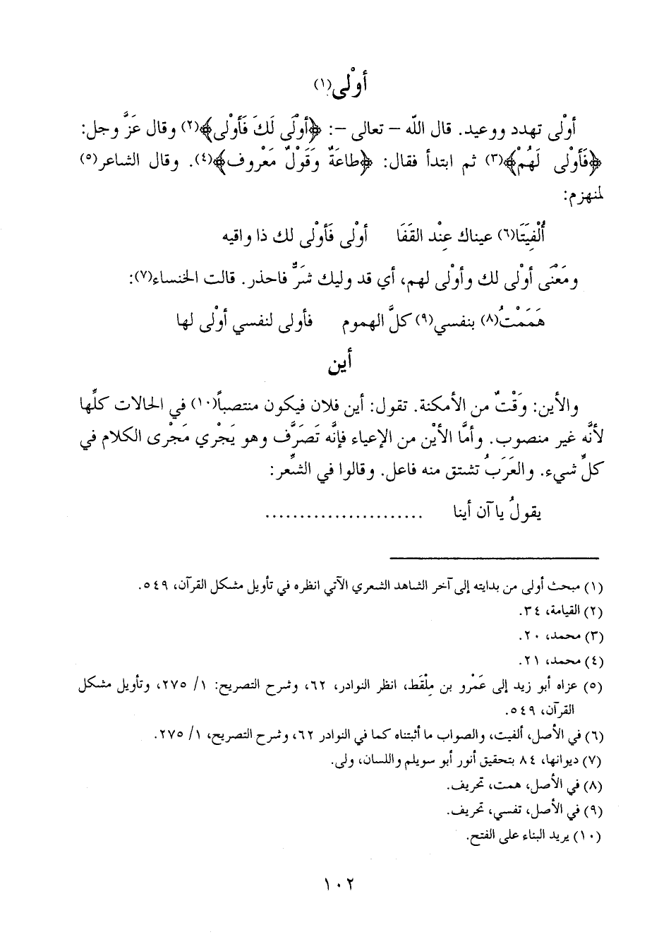 أولى تهدد ووعيد. قال الله- تعالى-: {أَوْلَى لَكَ فَأَوْلَى} وقال عز وجل: {فَأَوْلَى لَهُمْ} ثم ابتدأ فقال: {طَاعَةٌ وَقَوْلٌ مَعْرُوفٌ}. وقال الشاعر لمنهزم: