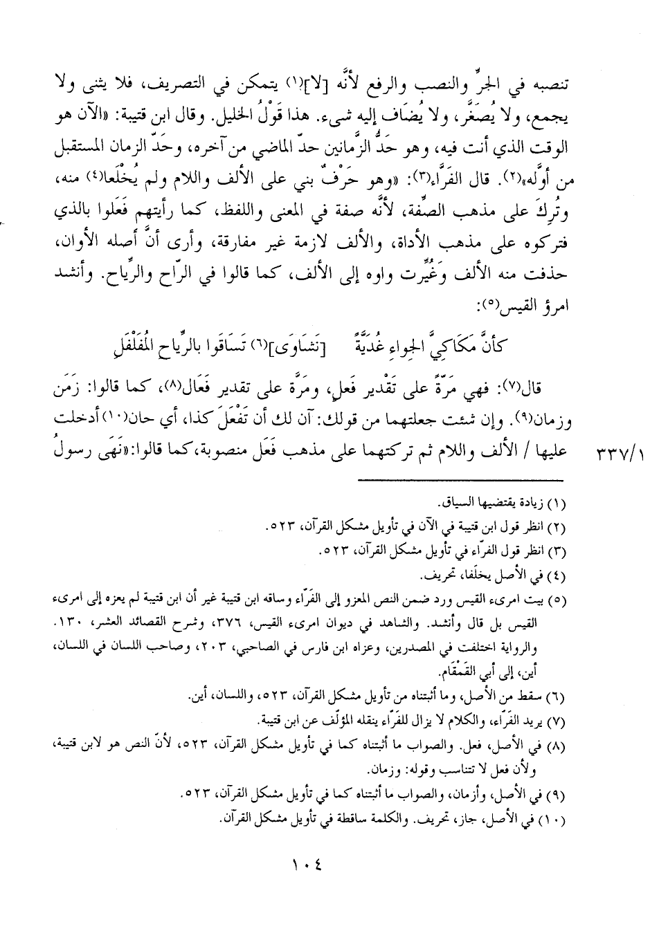 قال: فهي مرةً على تقدير فعلِ، ومرة على تقدير فَعَال، كما قالوا: زمن وزمان. وإن شئت جعلتهما من قولك: آن لك أن تَفْعَلَ كذا، أي حان أدخلت عليها 1/ 337 الألف واللام ثم تركتهما على مذهب فَعَل منصوبة، كما قالوا: "نهى رسولُ