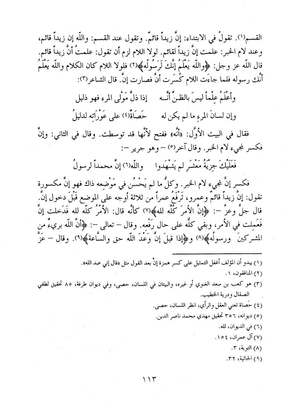 فكسر إنَّ لمجيء لام الخبر. وكلُّ ما لم يحسُن في موضعه ذاك فهو إنَّ مكسورة تقول: إنَّ زيداً قائمٌ وعمرو، ترفَعُ عمراً من ثلاثة أوجه على الموضع قَبْلَ دخول إنَّ. قال جل وعز -: {إِنَّ الأَمْرَ كُلَّهُ لِلَّهِ} كأنه قال: الأمر كله لله فدخلت إنَّ فعملت في الأمر، وبقي كلُّه على حال رَفْعِه. وقال - تعالى-: {أَنَّ اللَّهَ بَرِيءٌ مِنْ الْمُشْرِكِينَ وَرَسُولُهُ} و {وَإِذَا قِيلَ إِنَّ وَعْدَ اللَّهِ حَقٌّ وَالسَّاعَةُ}. وقال - عز