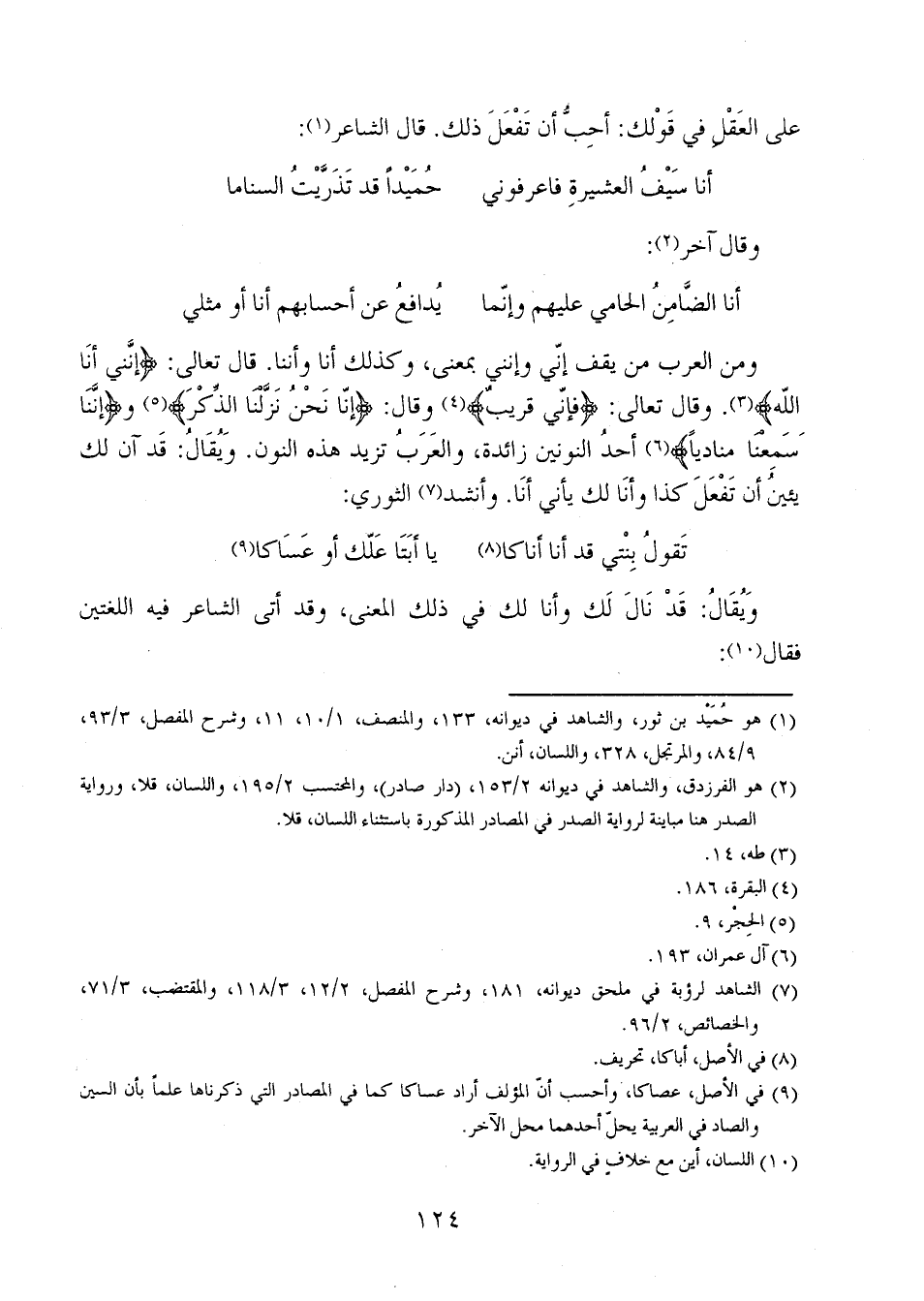 ومن العرب من يقف إني وإنني بمعنى، وكذلك أنا وأننا. قال تعالى: {إِنَّنِي أَنَا اللَّهُ}. وقال تعالى: {فَإِنِّي قَرِيبٌ} وقال: {إِنَّا نَحْنُ نَزَّلْنَا الذِّكْرَ} و {إِنَّنَا سَمِعْنَا مُنَادِياً} أحد النونين زائدة، والعربُ تزيد هذه النون. ويُقال: قد آن لك يئين أن تفْعَلَ كذا وأنا لك يأني أنا. وأنشد الثوري: