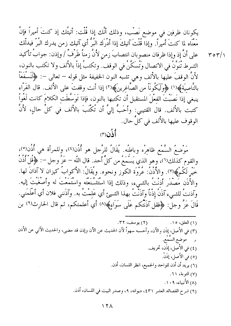 موضعُ السمْع ظاهره وباطنه. يُقالُ للرجل هو أُذُن، وللمرأة هي أُذُن، والقوم كذلك، وهو الذي يسمع من كل أحد. قال الله - عز وجل-: {قُلْ أُذُنُ خَيْرٍ لَكُمْ}. والأذُنُ: عُرْوَة الكوز ونحوه. ويُقال: الأكوابُ كيزان لا آذان لها. والأذن مصدر أذِنْتُ بالشيء، وذلك إذا استشنعته واستمعت له وأصْغَيْتَ إليه. وآذنت للشيء آذنُ إِذْناً وآذَنْتُ بهذا الشيء أي عَلِمْتُ به. وآذنني فلان أي أعلمني. قال عز وجل: {فَقُلْ آذَنْتُكُمْ عَلَى سَوَاءٍ} أي أعلمتكم، ثم قال الحارث بن