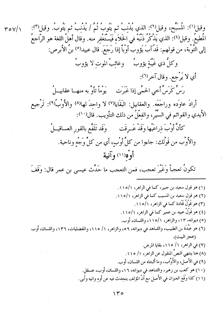 وقيل: المسبح، وقيل: الذي يُذنبُ ثم يتوب ثم 1/ 357 يُذْنِبُ ثم يتوبُ. وقيل: المطيع. وقيل: الذي يذكرُ ذنبهُ في الخلاء فيستغفر منه. وقال أهل اللغة هو الراجع إلى التوبة، من قولهم: قد آب يؤوب أوباً إذا رجع. قال عبيد بن الأبرص: