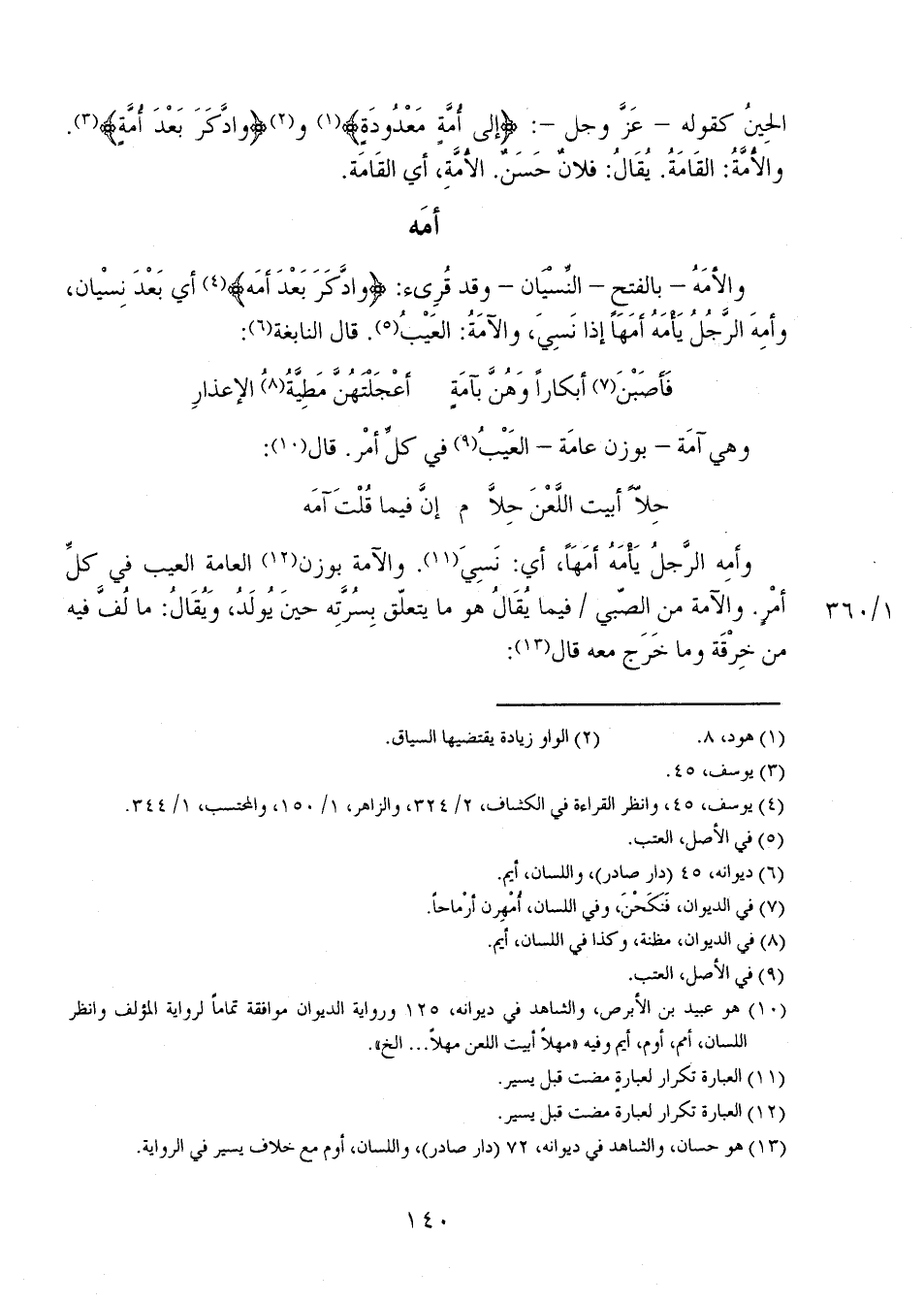 وأمِه الرَّجلُ يأمَهُ أمَهاً، أي: نسي. والآمة بوزن العامة العيب في كل أمر. والآمة من الصبي 1/ 360 فيما يُقالُ هو ما يتعلق بسرته حين يُولدُ، ويقال: ما لُفَّ فيه من خرقة وما خرج معه قال:
