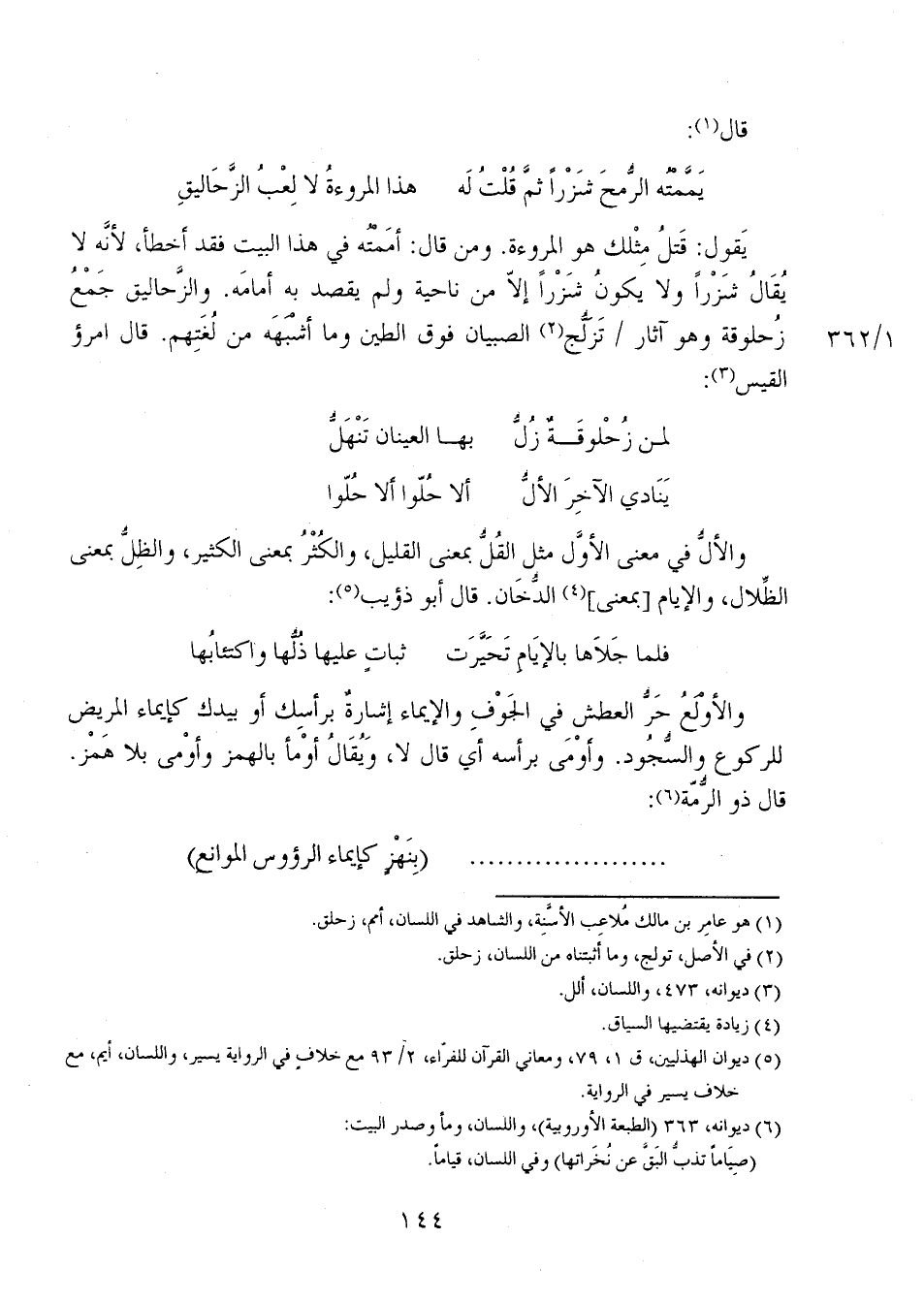 يقول: قتل مثلك هو المروءة. ومن قال: أممْتُه في هذا البيت فقد أخطأ، لأنَّه لا يُقالُ شزراً ولا يكونُ شزْراً إلا من ناحية ولم يقصد به أمامه. والزحاليق جمعُ زُحلوقة وهو آثار 1/ 362 تزّلُج الصبيان فوق الطين وما أشبهه من لُغَتِهم. قال امرؤ القيس: