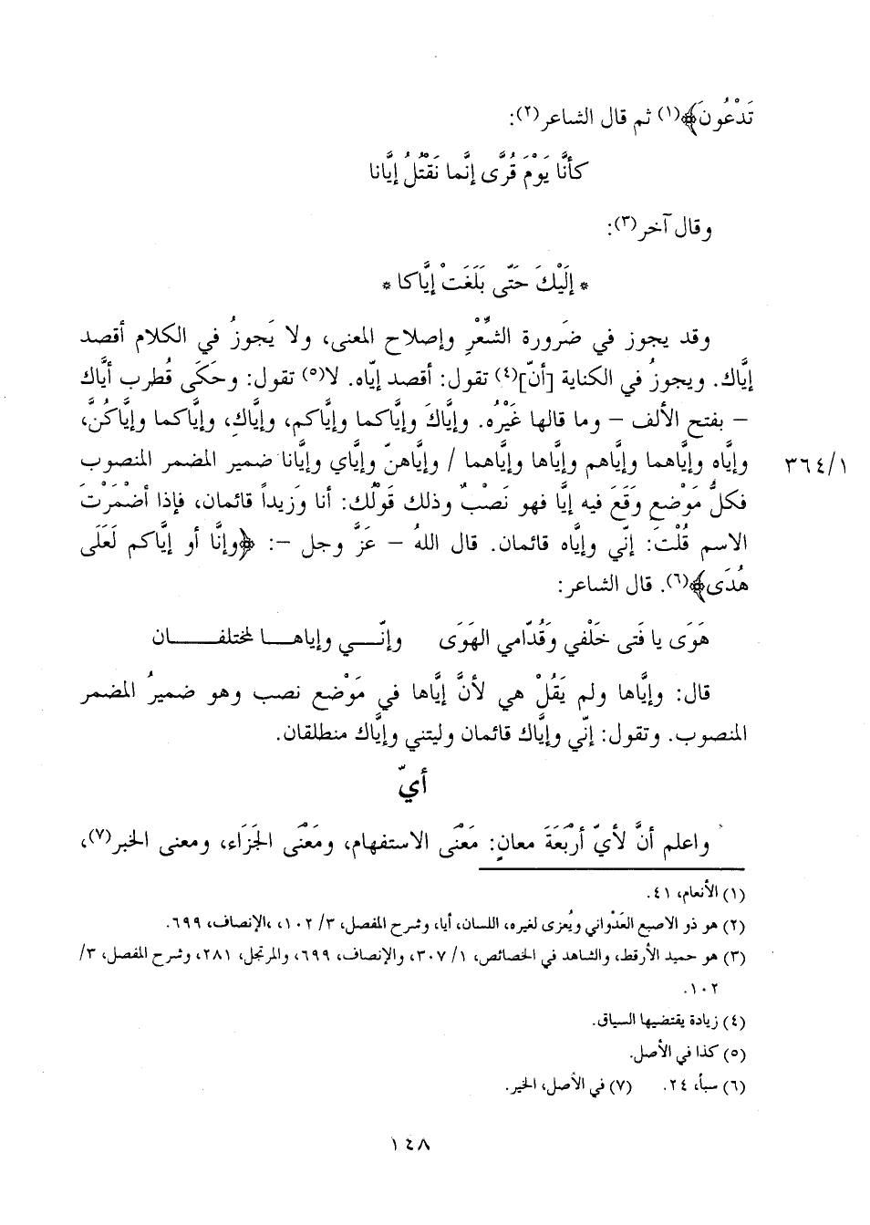 وقد يجوز في ضرورة الشعر وإصلاح المعنى، ولا يجوز في لكلام أقصد إيَّاك. ويجوزُ في الكناية [أنّ] تقول: أقصد إيّاه. لا تقول: وحكى قُطرب أيَّاك - بفتح الألف - وما قالها غيرُه. وإيَّاك وإيَّاكما وإيَّاكم، وإيَّاكِ، وإيَّاكما وإيَّاكُنَّ، وإيَّاه وإيَّاهما وإيَّاهم وإيَّاها وإيَّاهما 1/ 364 وإيَّاهن وإيَّاي وإيَّانا ضمير المضمر المنصوب فكلُّ موضع وقع فيه إيَّا فهو نصبٌ وذلك قولك: أنا وزيداً قائمان، فإذا أضمرتَ الاسم قلت: إني وإيَّاه قائمان. قال الله - عز وجل-: {وَإِنَّا أَوْ إِيَّاكُمْ لَعَلَى هُدًى}. قال الشاعر: